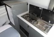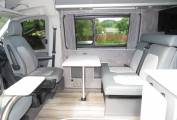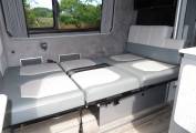 The layout is ideal for 4 people or 2 travelling companions who are looking for two good sized beds. At the front you have a comfortable lounge/dining area which has a front facing sofa, dinette table and the front to seats that swivel around. The double sofa is an electric rock and roll bed, making this simple and easy to set up. Moving back you have a galley style kitchen one side, with 2 burner gas hob, microwave, fridge, oven, sink and mixer tap. All work surfaces and table tops are made out of reclaimed plastic, helping give back to the environment you hope to enjoy.At the rear you have a large garage area that features an electric drop down bed and also has two side facing sofas - which can make up a 5th smaller bed. The camper comes with a washroom that features a toilet, sink and wet room shower. Heating is provided by a diesel Eberspacher heater.