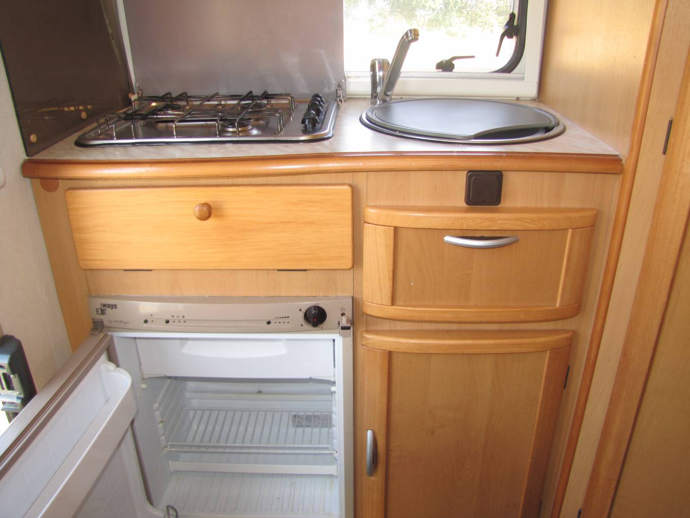 The Kitchen area is fully equipped with Sink with mixer tap, 3 x gas hobs, three-way fridge with freezer compartment, combined oven and grill, plenty of storage above and below.