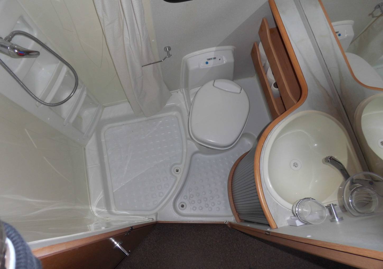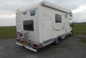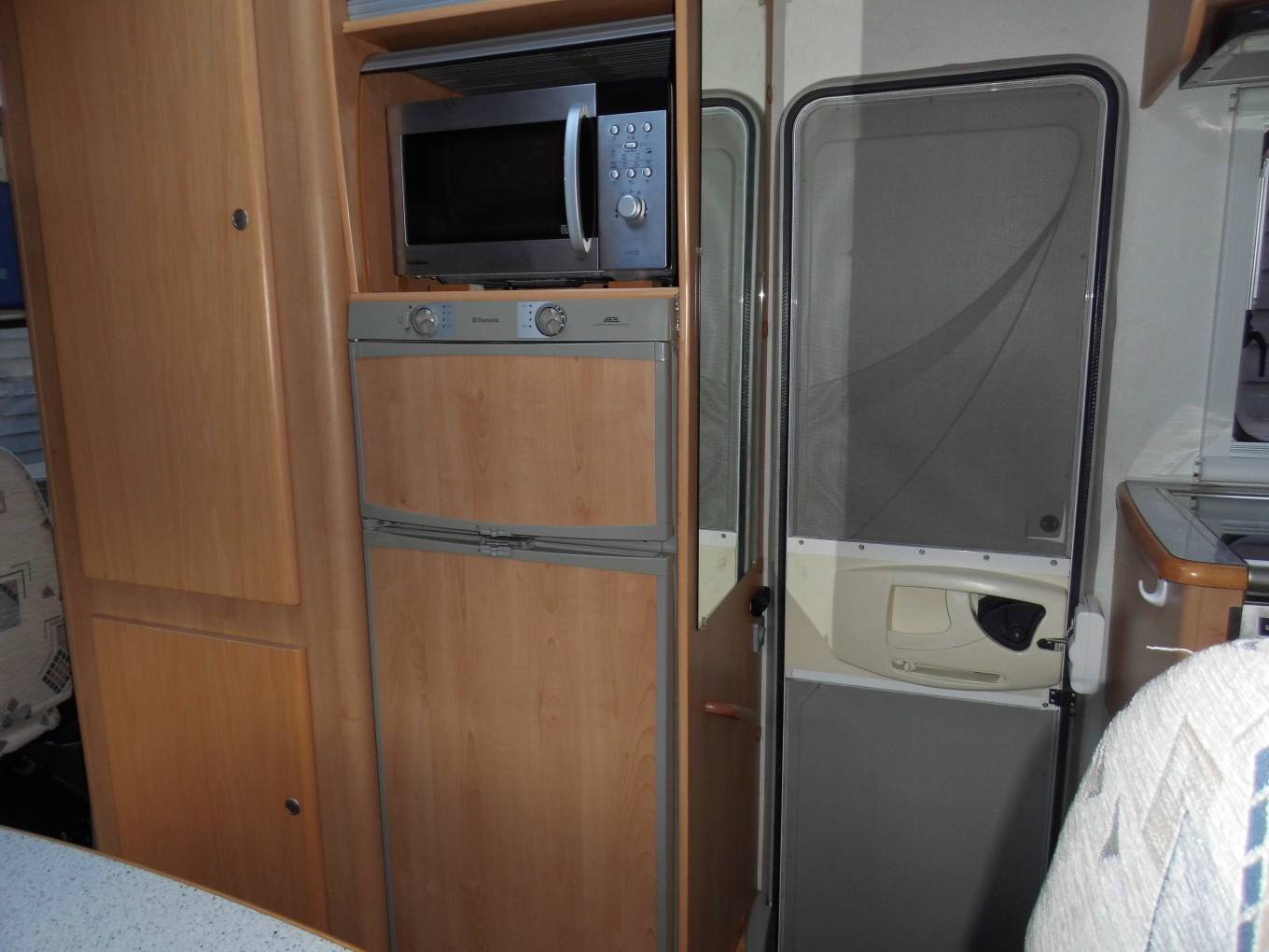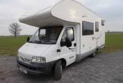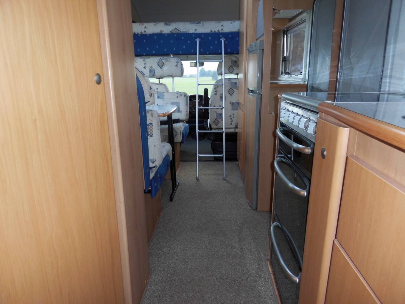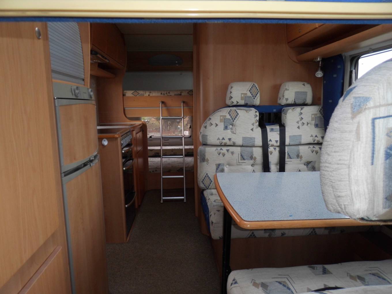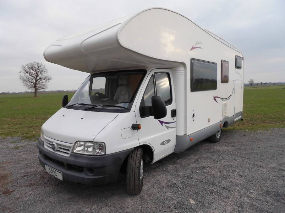 Here is a 2005 McLouis Tandy Plus 620, eight berth on a Fiat Ducato Chassis with a 2.8 diesel engine and manual transmission. It has 34375 miles and MOT to August 2019. In excellent condition inside and out. On the rear is a ladder for access to the roof, a reversing camera eye and a rack for 3 bikes, also a ball hitch tow bar. On the near and offside is access to the full size garage which can convert to be used as an extra double bed. On the offside is a wind-out canopy over the habitation door. Entering this door and turning left is the kitchen with inset sink and mixer tap, to the left is a 4 gas hob, oven and grill with extractor fan above and storage cupboards under the worktop and above the sink. Following on to the rear there are 2 double beds, the bottom bed converts to the garage by lifting the hinged fold-away bed to the upright position, for space in the garage. Turning around, and on the left is the large washroom with shower, toilet and hand basin in a vanity unit with large mirror. Moving further on and into the lounge-dining area, on the right is a large fridge freezer with a Goodmans microwave fitted into a cupboard. Above there is a cupboard with a base and wiring for a TV. Next to this is the wardrobe with cupboard space underneath. Opposite is a dining area with seating for 4 people, the forward facing seat has 2 three point seat belts and storage under, the rear facing seat has 2 lap straps with a water storage tank under. There is also further storage around the top. the table can be dropped down to form another double bed, moving on to the cab area there is a large over-cab bed, both driver and passenger seats have 3 point seat belts and there is a radio-CD player. Mounted on the dashboard is the reversing camera screen. There are also silver screens to fit the front and side windows. This has been a very well looked after vehicle which has warm air heating, fly and blackout screens to windows in the habitation area and carpeting throughout with very clean upholstery.