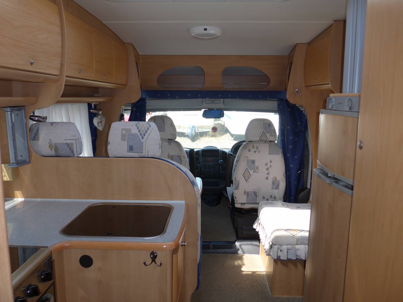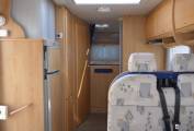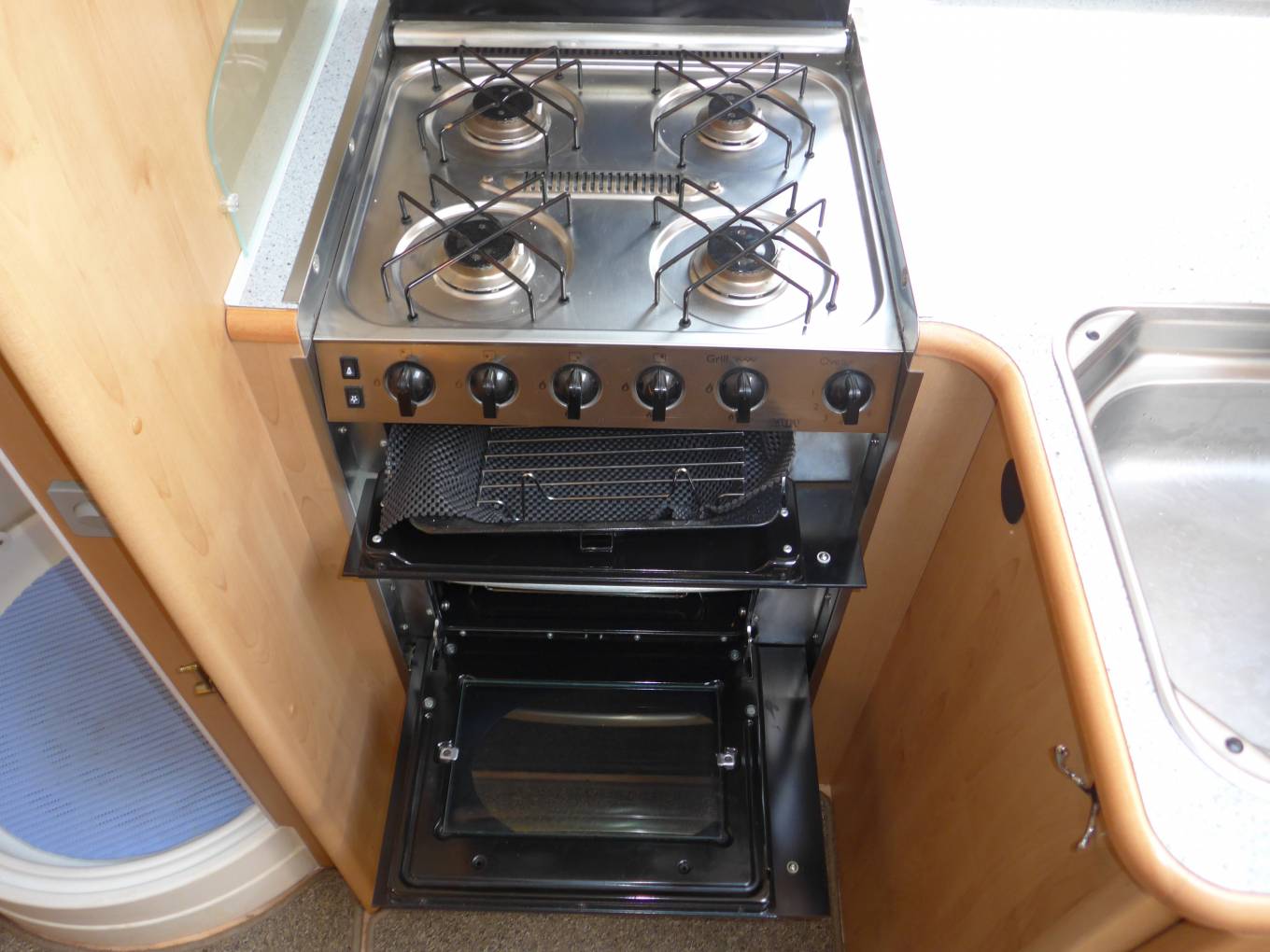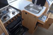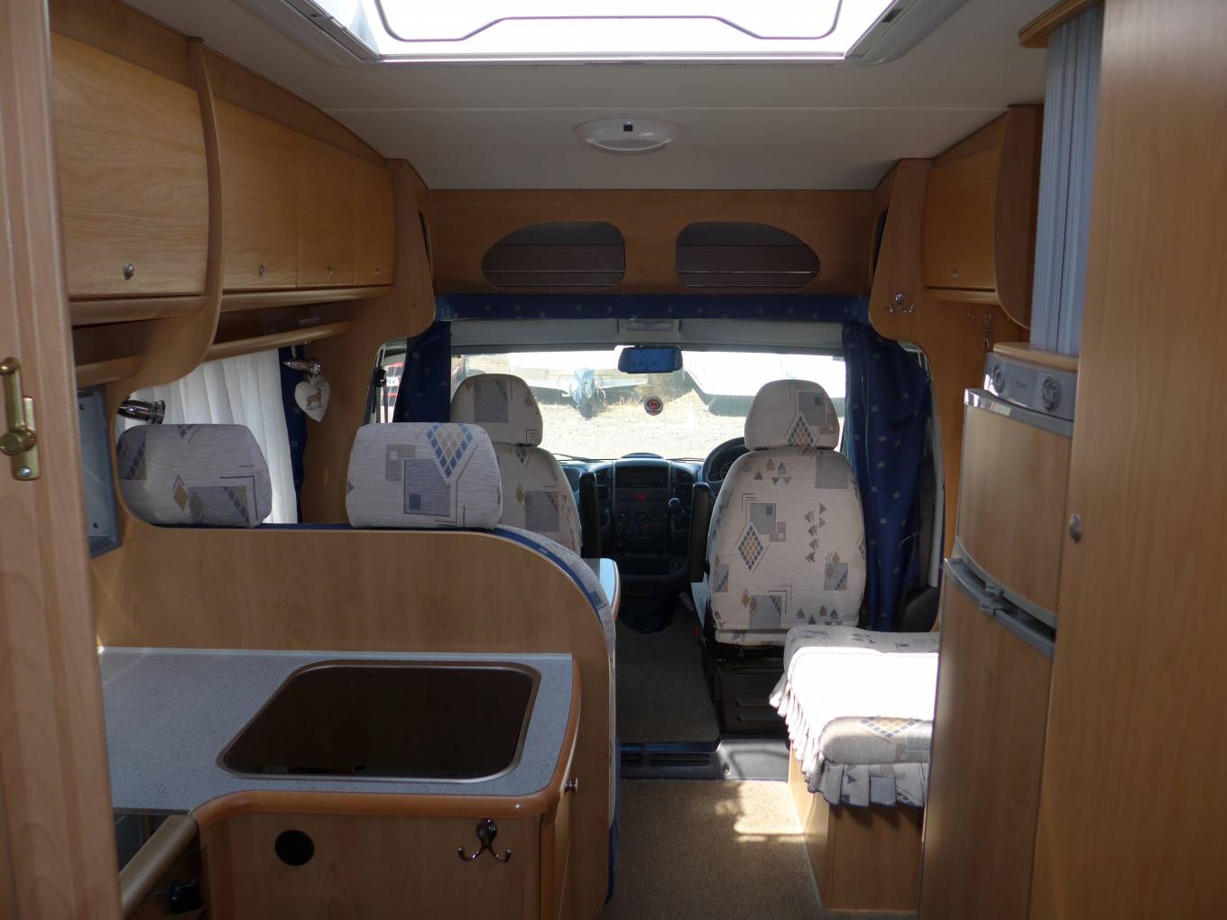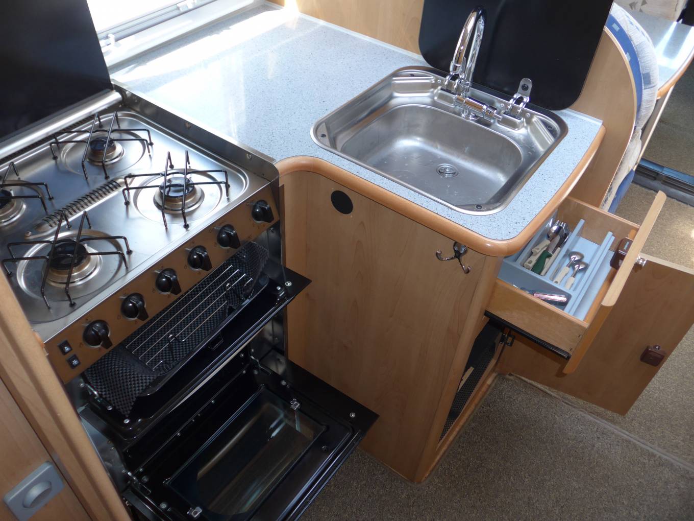 L shape kitchen with Smev full gas oven and Separate grill, 4 gas burner hob, Stainless steel sink with glass hinged cover, Dometic 140Litre fridge with separate freezer compartment and Large Heki roof light. Truma gas blown air heating. Large wardrobe.