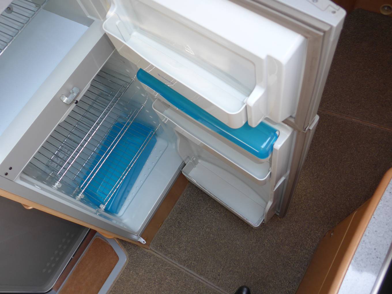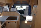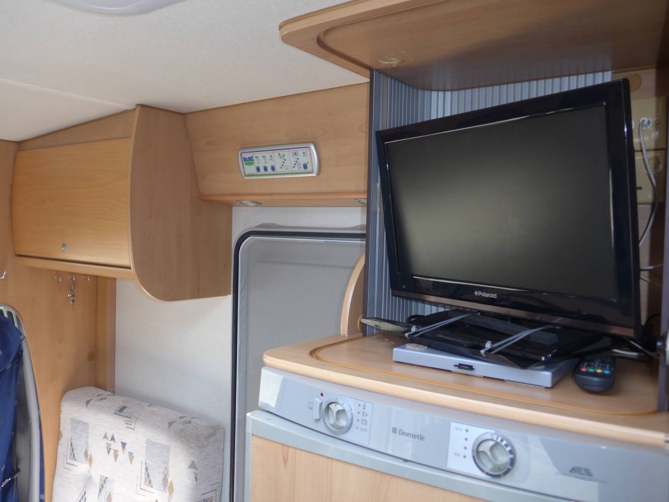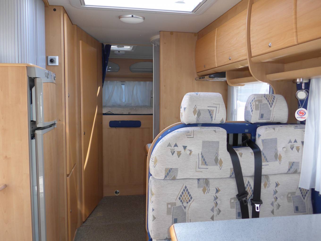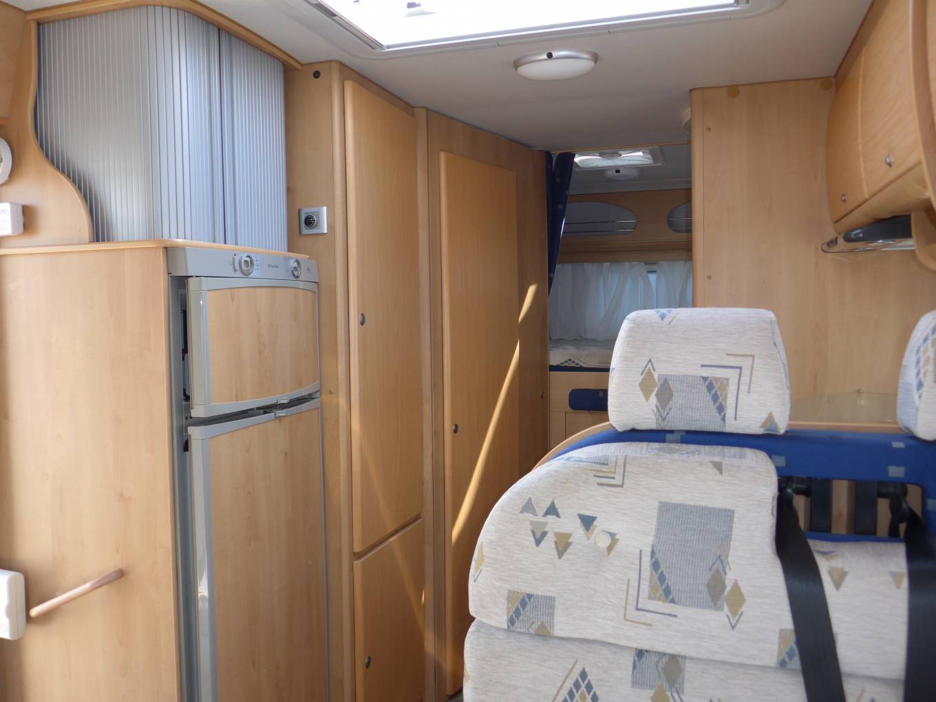 L shape kitchen with Smev full gas oven and Separate grill, 4 gas burner hob, Stainless steel sink with glass hinged cover, Dometic 140Litre fridge with separate freezer compartment and Large Heki roof light. Truma gas blown air heating. Large wardrobe.