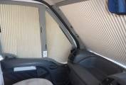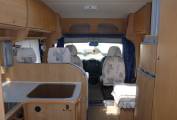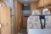 Lounge comprising Storage shelving over cab, Privacy curtain to front cab, Twin swivel front seats, Side Sofa, Removable carpets, Half dinette with 2 seatbelts, Dinette table and TV cabinet with roller shutter doors containingTV / DVD Player.