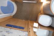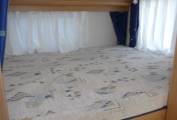 Rear fixed Double with Transverse bed over garage with integrated access door to garage underneath, Privacy curtain to bed and Fiamma Turbo electric roof vent over bed.