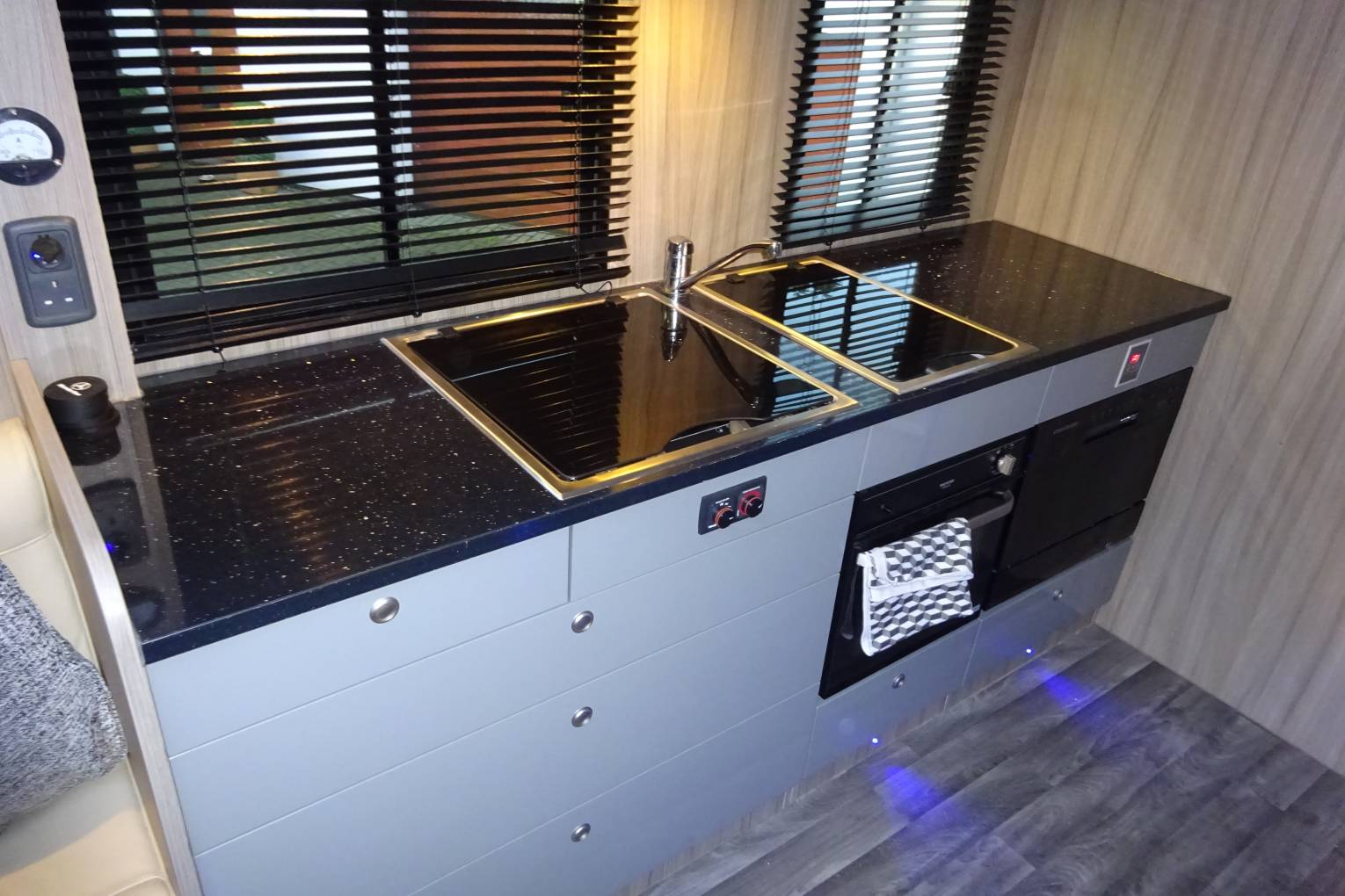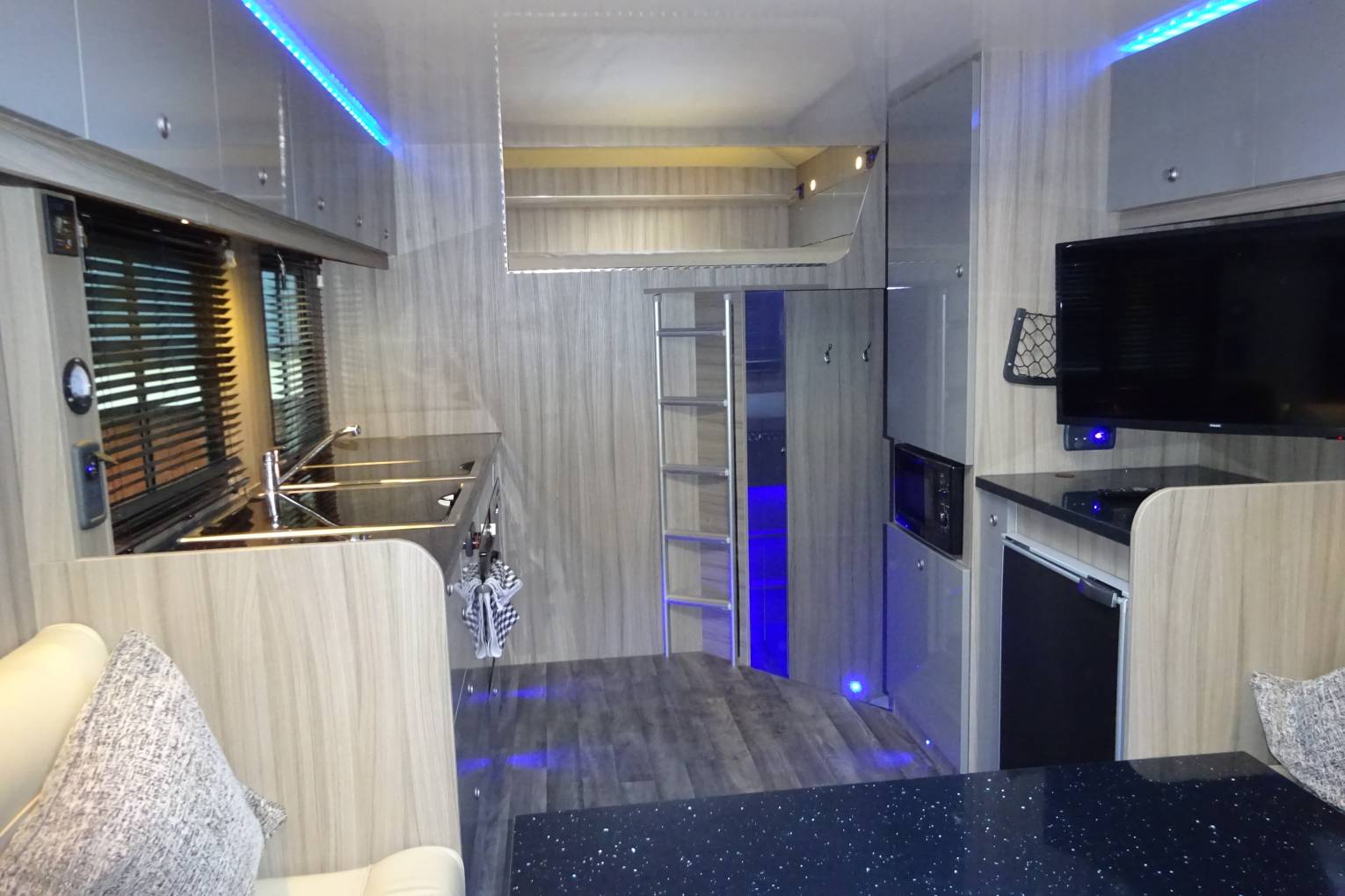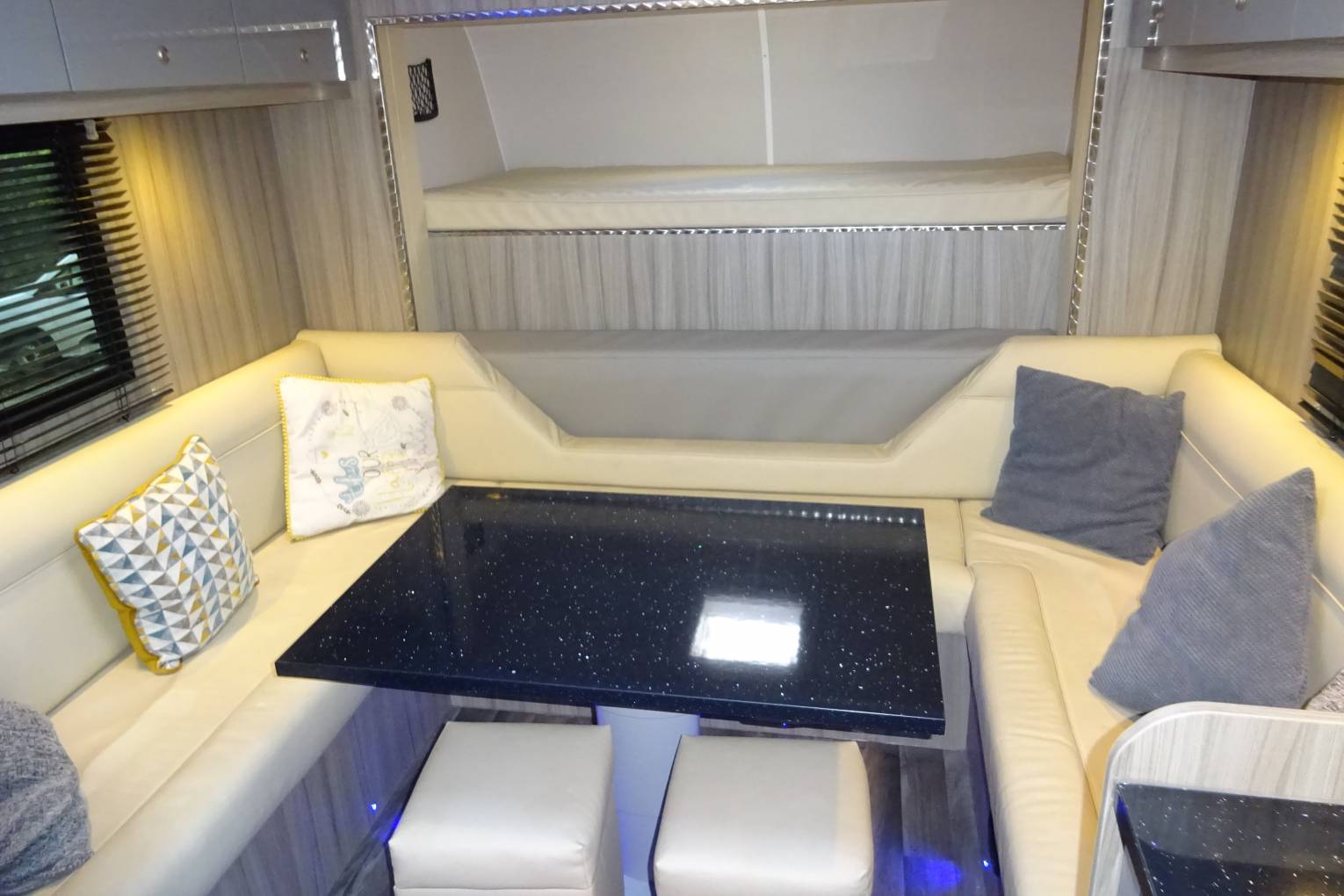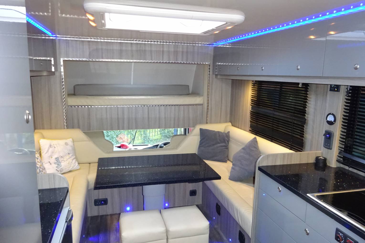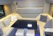 The motorhome interior is finished in leather throughout the seating areas and beds. The cupboards, draws and lockers are finished to a high gloss standard. It is fitted with led lights through out including mood lighting that can be set to a range of colours. With the excellent use of space in this motorhome it feels more like you are sitting in your living room than in a motorhome.