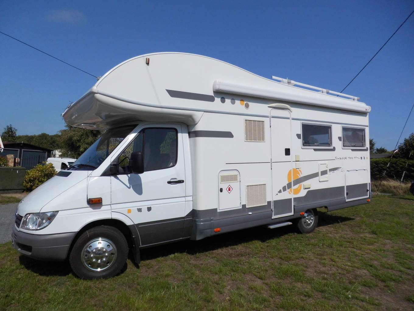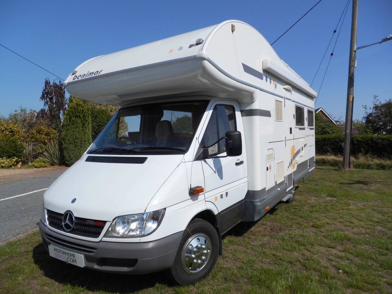 BENIMAR EUROPE TOP ST-L MERCEDES SPRINTER 316CDI SEMI AUTOMATIC GEARBOX. This very low mileage 5 berth motor home is a shining example of a light and airy motor home ideal for families with it's 4 seat belts and ample seating areas. On entering the motor home via central door you face a central dining area with table which converts into a bed. The upholstery is light and inviting. The captain seats swivel making this one of two ideal socialising areas.Opposite to this is where the fridge, freezer, microwave and wardrobe are housed. Moving to the centre of the motor home is where the kitchen is situated. It has a 4 burner gas hob and extractor with grill and oven. The sink has a glass lid allowing extra surface area. This Kitchen area has the added bonus of having LED lighting for that modern feel. A dustbin is built into the entrance door to the motor home. Opposite the kitchen is a very spacious washroom comprising of two separate compartments divided by a shower curtain. The washroom consists of a walk in shower, toilet sink and vanity unit. The washroom also has an electric extractor fan in the skylight. To the rear of the motor home there is a U shaped lounge with a raised floor in the rear section. This area has a table and can be converted into a double bed. It also has a foldout TV. It is complimented with LED lights. The motor home has habitation air conditioning and a central electric sunroof. The windows have fly screens, blinds and curtains. Above the cab there is a double sleeping area with windows. It comes with a Tom Tom sat nav.