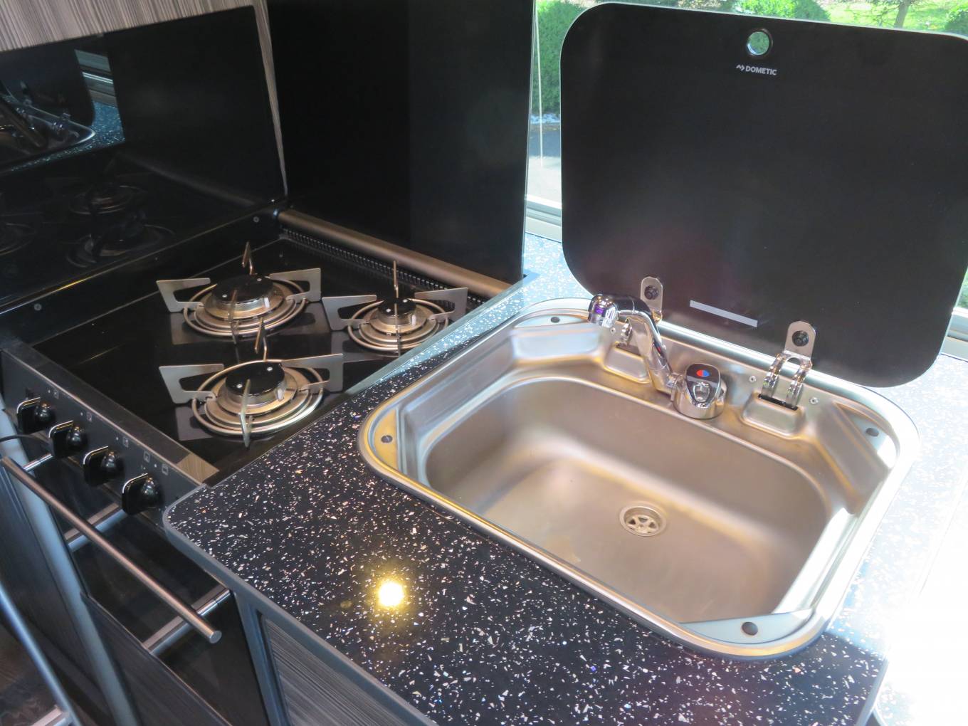 Smev Combi 2 x burner hob and sink, chrome tap and glass lid. 65 litre Compressor Fridge with Freeze and Microwave