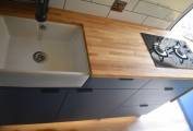 Interior: - Full insulation and vapour barrier - Cladding/tiling/painting all interior walls and garage area - Bespoke kitchen, living area and bathroom construction - Bespoke storage including above cab, wardrobe and overhead units - Solid oak worktop - Baby Belfast sink with hot and cold water mixer tap - Thetford gas hob (2 burner) - Underslung LPG tank with external fill point - Indoor hot water shower - Bespoke tambour rolling door for bathroom - Rear shower (garage area) - Underslung fresh and waste water tanks (70L capacity) - Truma 6E water and air heater (230V and gas) - Victron SuperPack Lithium battery bank 2 x 100Ah - Victron Battery to battery charger - Victron Solar power charging system - Victron Multiplus 12/800/35 - Victron Cerbo GX with touch screen display - 230V hook up with RCD and MCBs - 12V LED lights with touch screen dimmer switch - 12V USB charging sockets 38,300.00 Page 2 of 2 12V USB charging sockets - 2 x 230V double plug sockets with 2 x USB charging points - Bespoke seating area with upholstered cushions and table - Fixed double bed including standard mattress - Smoke detector and carbon monoxide alarm - Integrated blinds for windows - Flyscreen for side door.