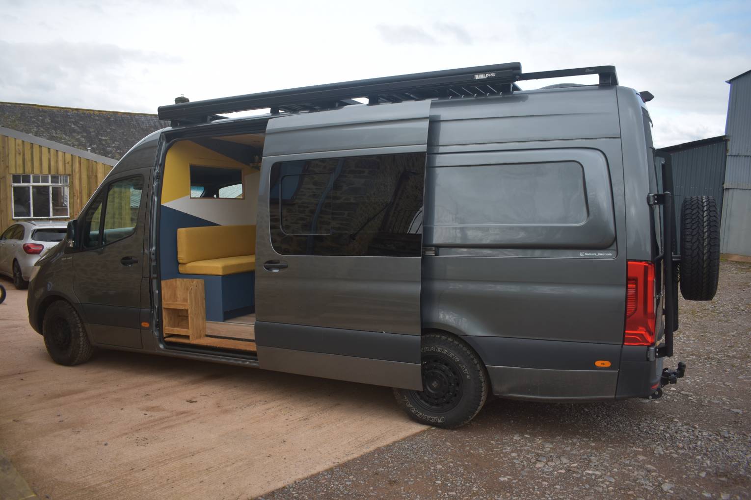 This stunning van is made for exploring off grid with a fantastic specification including a fixed double bed, a large rear storage area, front runner roof-rack with rear ladder, 2 x 175w solar panels, 2 x 100ah lithium leisure batteries, "Grabber" all terrain tyres and much more. Comfort however is not compromised as you have an automatic gearbox, cruise control, heating, indoor and outdoor showers, portaloo, and a hand crafted kitchen area with Belfast sink and gas hob.