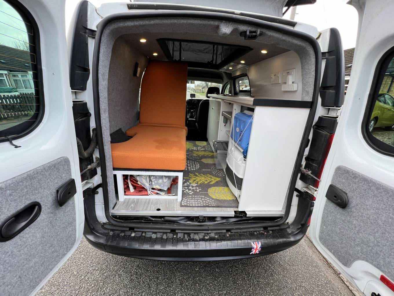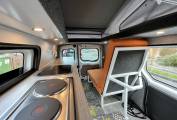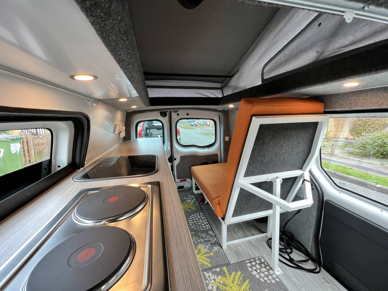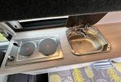 This all electric conversion has a twin hotplate and sink with a pumped water supply in the kitchen as well as a 12 volt cool box.