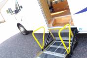 Underneath the entrance is a ‘back in box’ wheelchair lift, with the push of a button the lift slides out from under the motorhome and can be positioned at ground level so the wheelchair can be pushed onto it, push the button again and the wheelchair is slowly lifted up level with the entrance of the motorhome. Once inside there are anchor points and seatbelts attachments to ensure the wheelchair and wheelchair user is secure whilst travelling. Next to the wheelchair place you will find a single travelling seatbelt.
