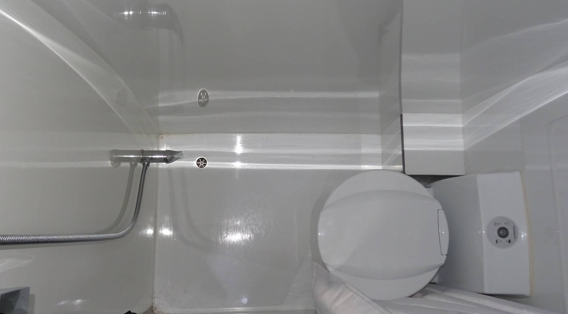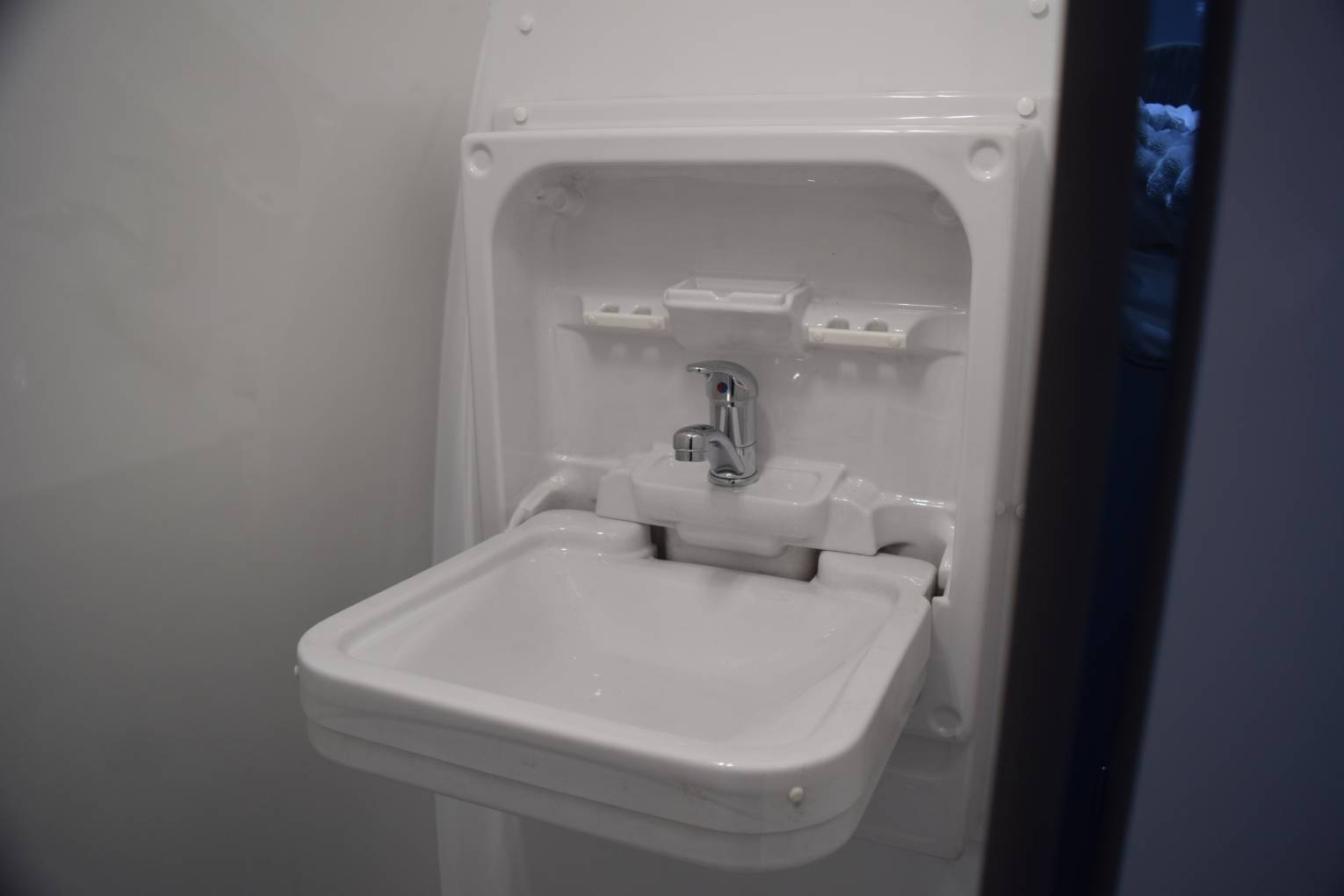 The shower and toilet washroom also has a drop-down basin with tap that is over the toilet .