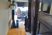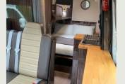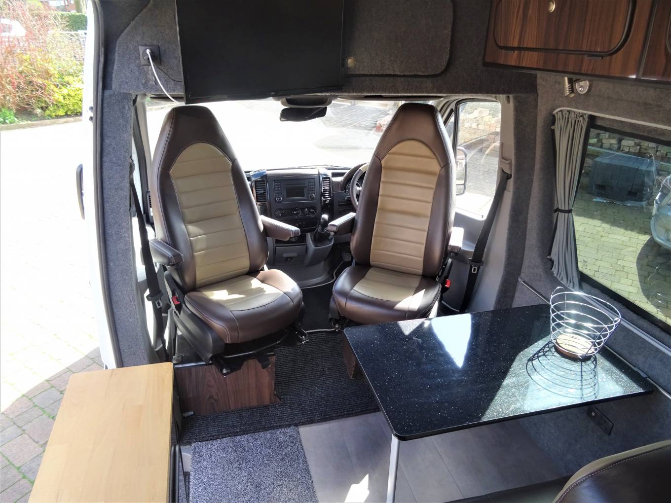 Located in the centre of the roof above the dining area is a large Cello flat screen TV which is connected via a bracket which can be positioned to face the dinette or even out of the side door. Here we also have the rear 2 travelling seats which along with the passenger and drivers seat that both swivel to face the dinette. The upholstery on the seats are second to non and gives a real luxury feel to the camper along with the mahogany epoxy resin affect units.