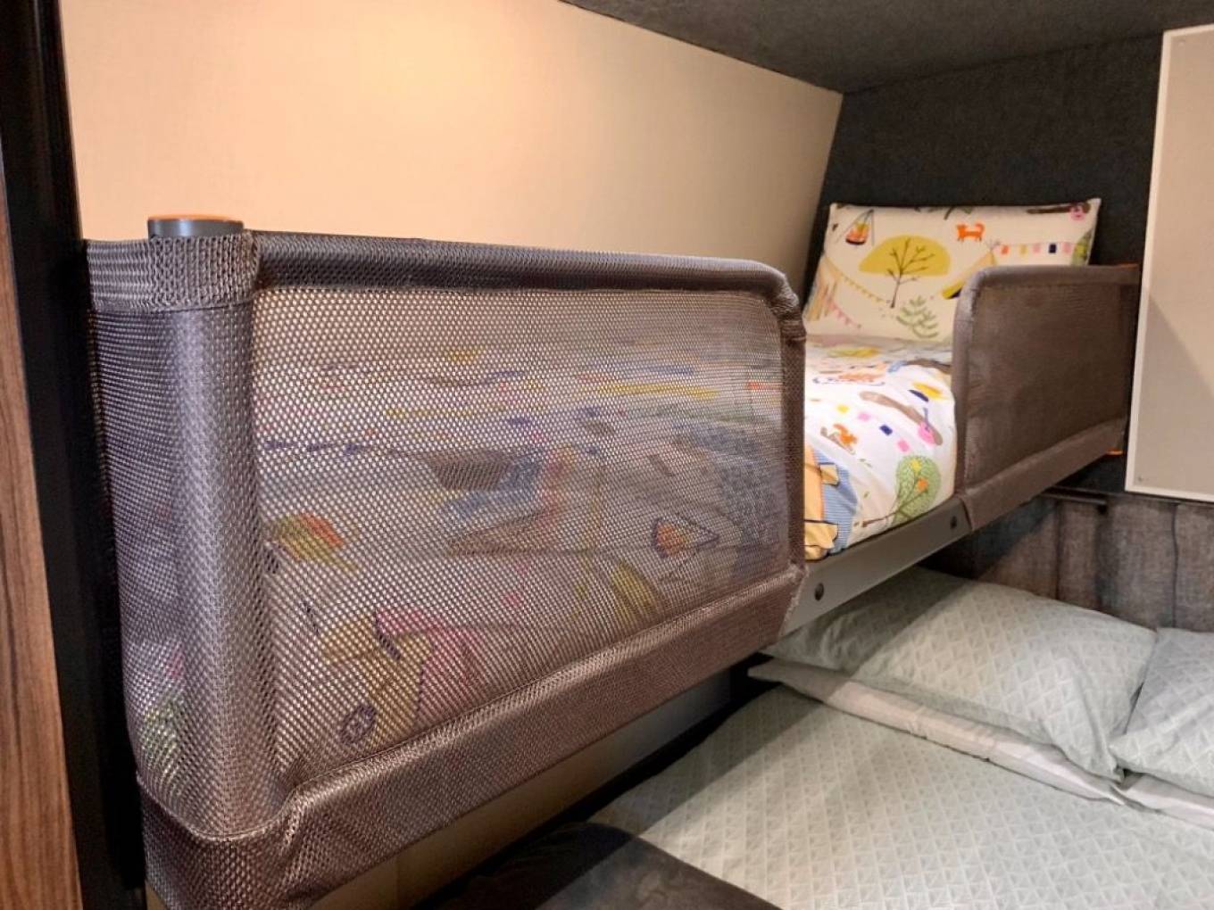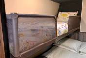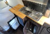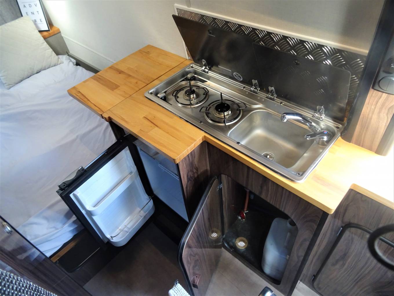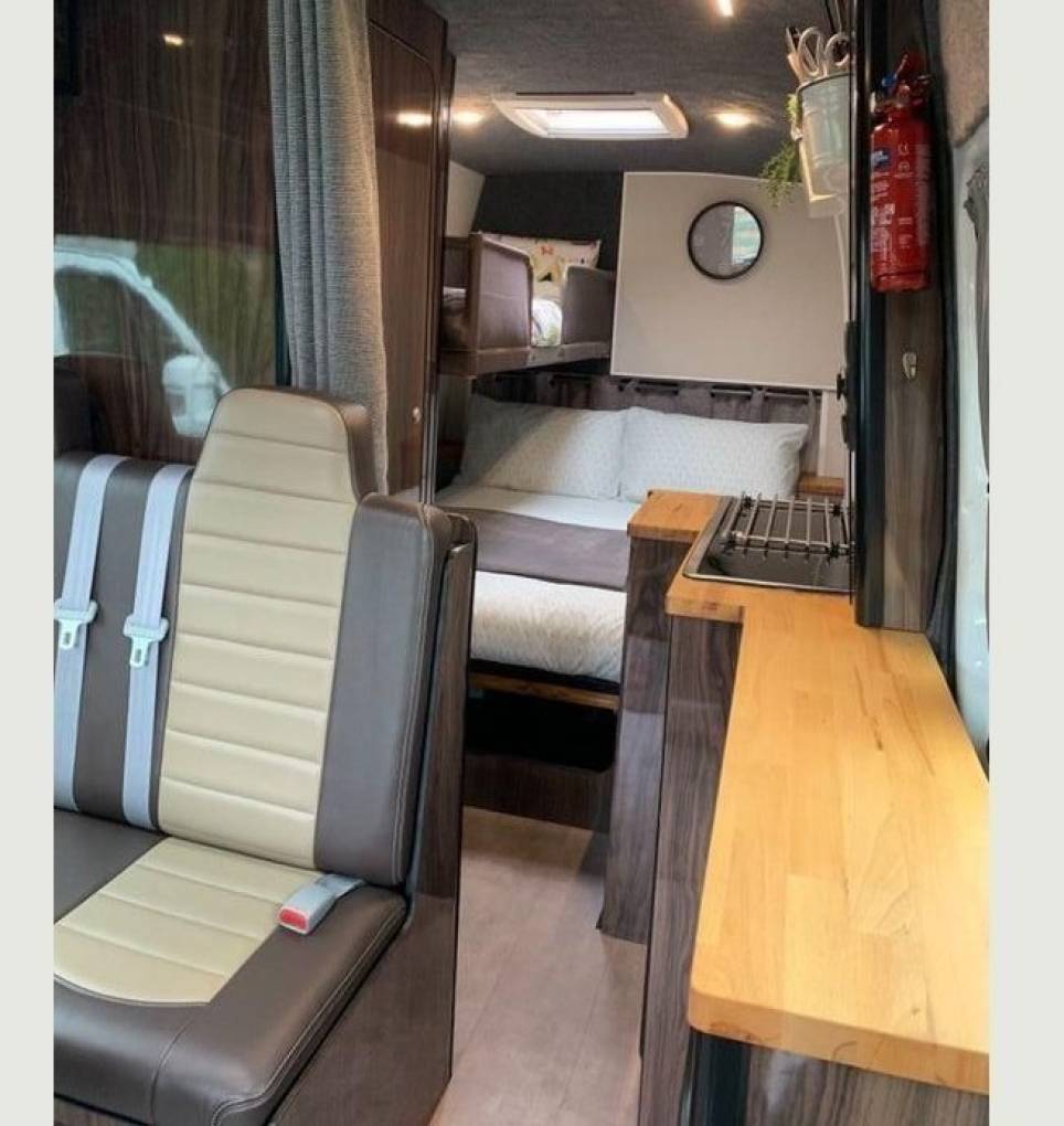 Starting at the rear of the camper is the large fixed double bed with a single bunk bed just above which is perfect for a child. Also at the rear behind the bed which is accessed from the rear doors is a really clever accessory storage unit which can be utilised as per the photo.