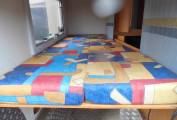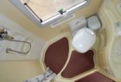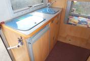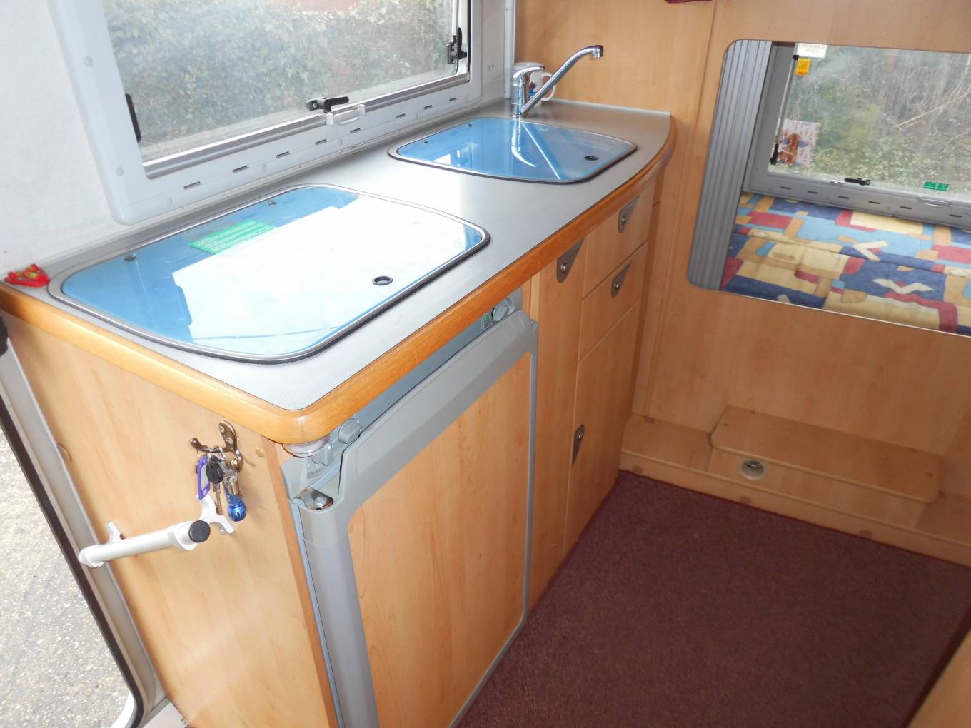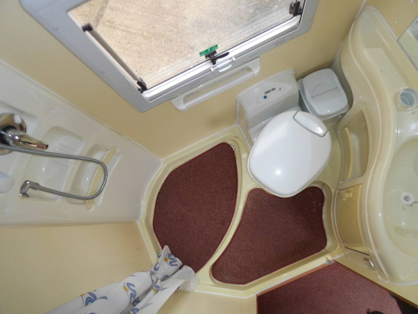 The kitchen which is situated towards the rear of the motorhome is equipped with a grill but no oven, a 3 gas burner hob, a microwave, a 3 way fridge freezer and a stainless steel sink with mixer tap so you have plenty of options to rustle up a nice meal. Opposite the kitchen is the bathroom which has a shower, a cassette toilet, a wash basin with mixer tap and a storage cupboard for your toiletries. This bathroom is flooded with loads of natural light thanks to the large window so getting yourself ready to go out shouldn't pose any problems.