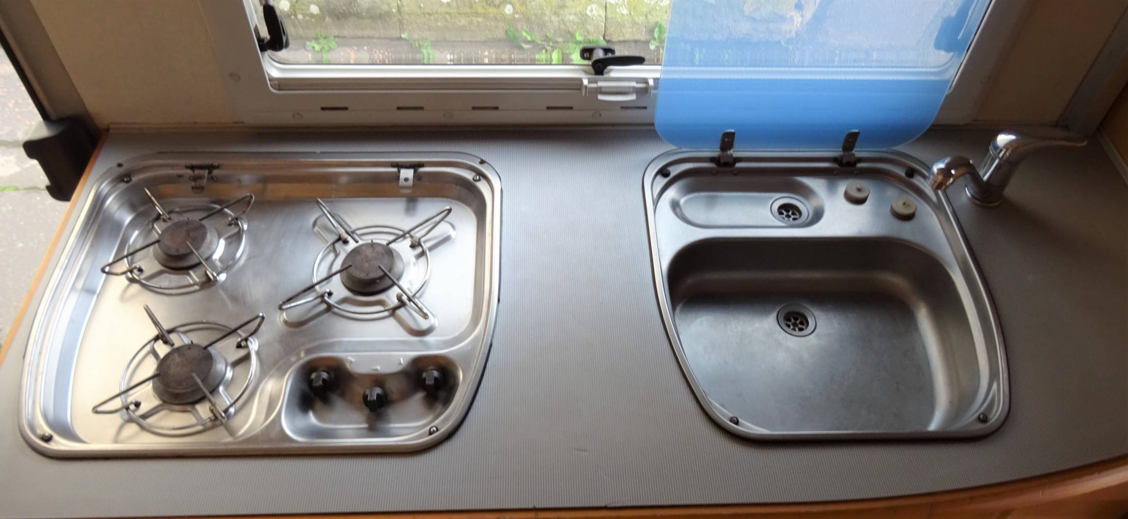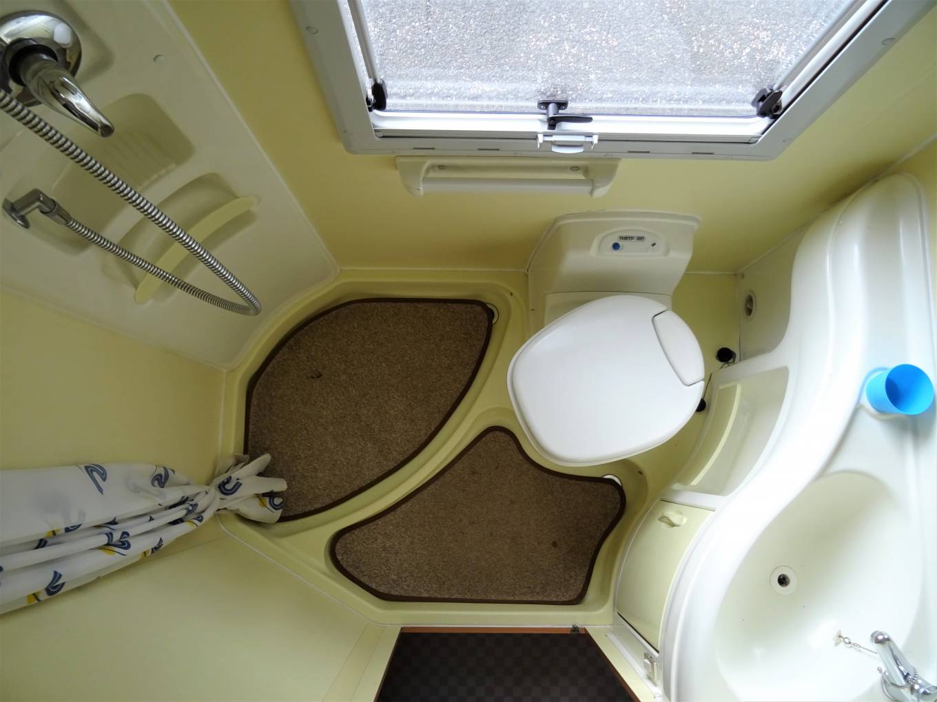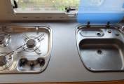 The kitchen which is situated towards the rear of the motorhome is equipped with a 3 burner gas hob, a microwave, a fridge freezer and a stainless steel sink with mixer tap. Opposite the kitchen is the bathroom which has a shower, a cassette toilet, a wash basin with mixer tap and a storage cupboard for your toiletries. This bathroom is flooded with loads of natural light thanks to the large window so getting yourself ready to go out shouldn't pose any problems.