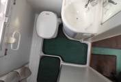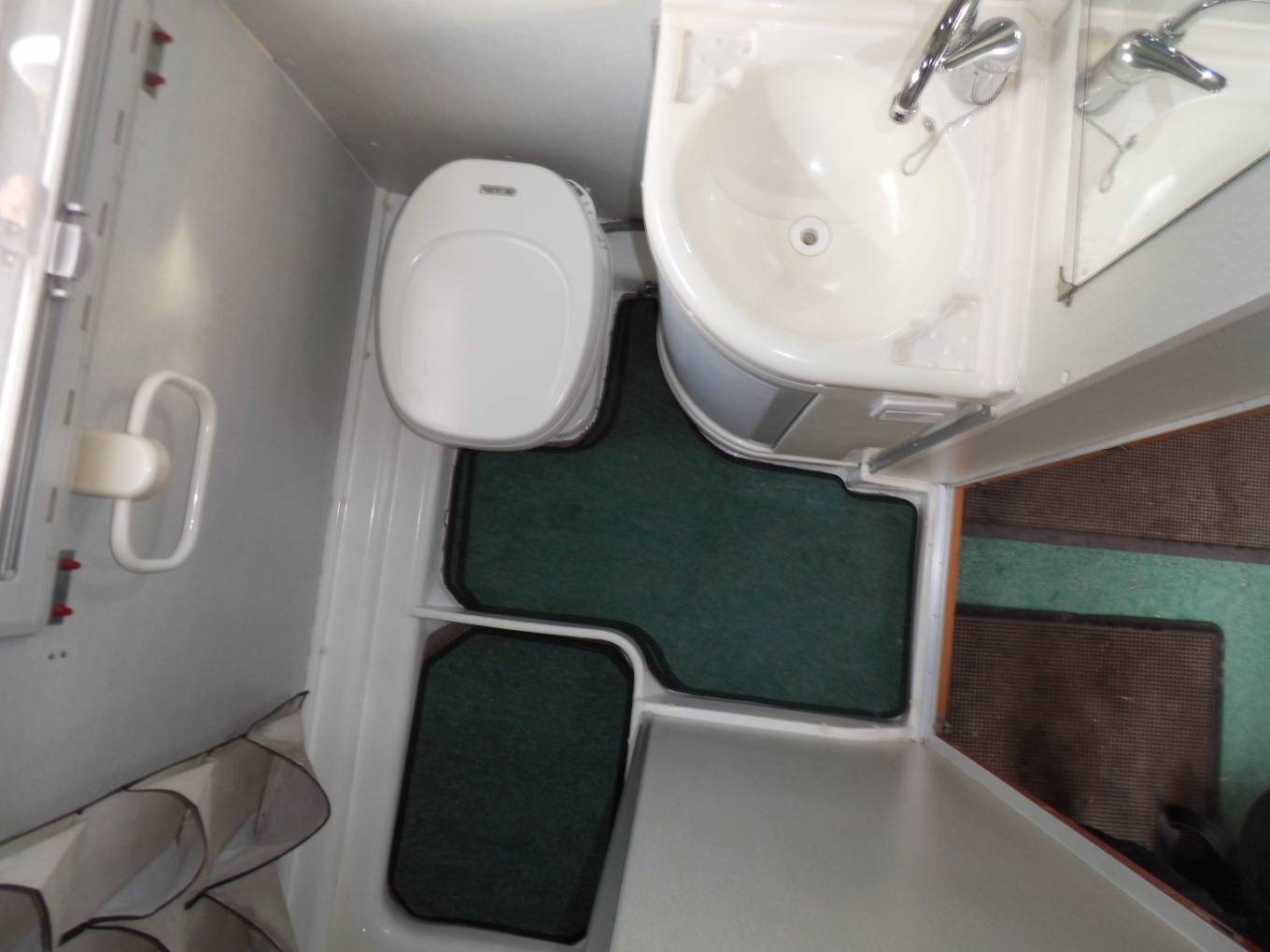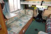 This is a 6/7 berth motorhome with 4 travelling seat belts. There are two bunk beds at the rear, a large overcab bed, a dinette that makes into another double bed and a sofa that can be used as a single bed. At the rear of the vehicle is the washroom which features a shower, a cassette toilet, a wash basin with mixer tap, a large mirror and some storage space so you have everything you need to keep yourself fresh on your travels.