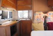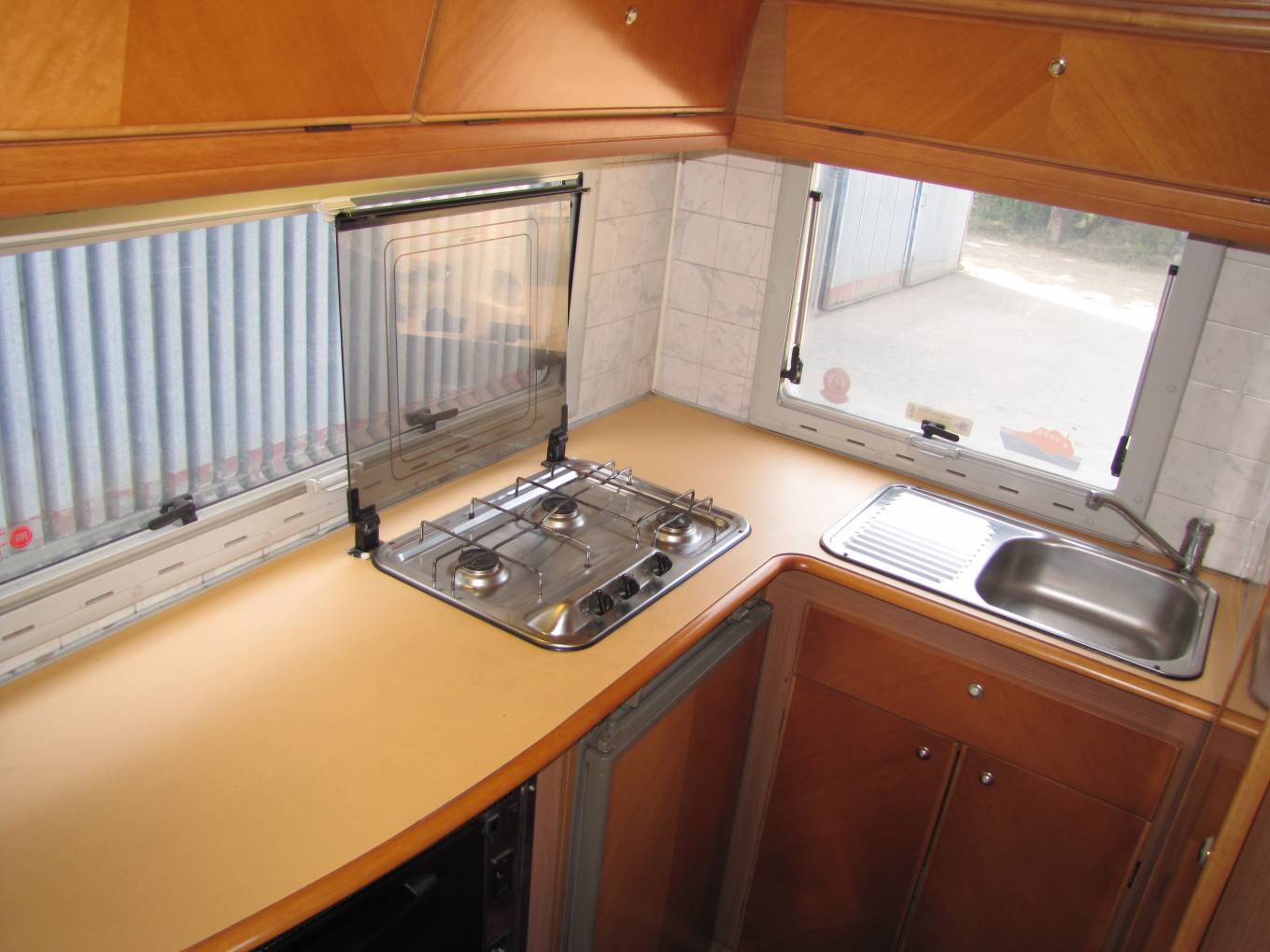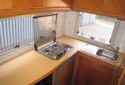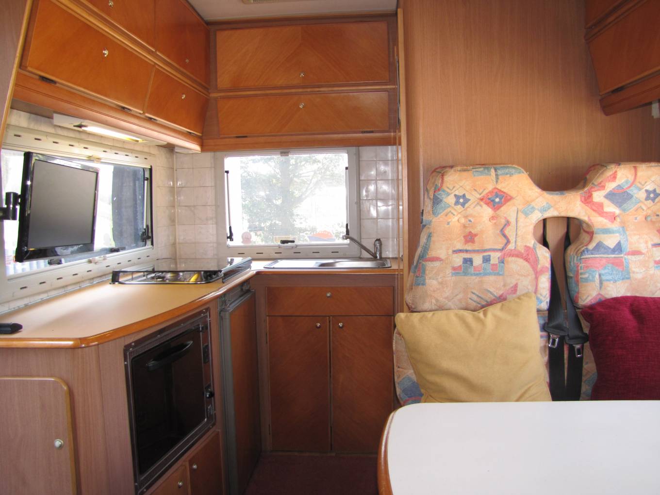Upon entering the habitation area you will find the kitchen to the rear of the vehicle, the kitchen comes equipped with oven and grill, 3 way fridge and small freezer compartment, sink with drainer, along with 3 gas ring hob, plenty of storage above and below.
