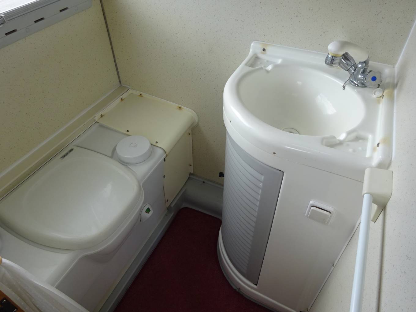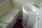 Corner washroom with shower, basin and cassette toilet.