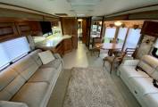 Firstly, we start at the rear in the master bedroom. The master bedroom features a large comfortable double bed, a wardrobe with ample wardrobe space and a TV. Next, is the washroom area. This includes a large separate shower cubicle with a wash basin opposite. Adjacent, in a separate room is were you will find a toilet and another wash basin. As we walk through this bright and spacious RV we arrive in the well equipped kitchen. The kitchen includes a large separate fridge freezer, hob, oven, grill, microwave, sink and ample storage. Opposite is a dining table with 4 seats. To the front is a huge living area which can be enjoyed by the whole family and when the night draws in converts to 2 comfortably double beds.