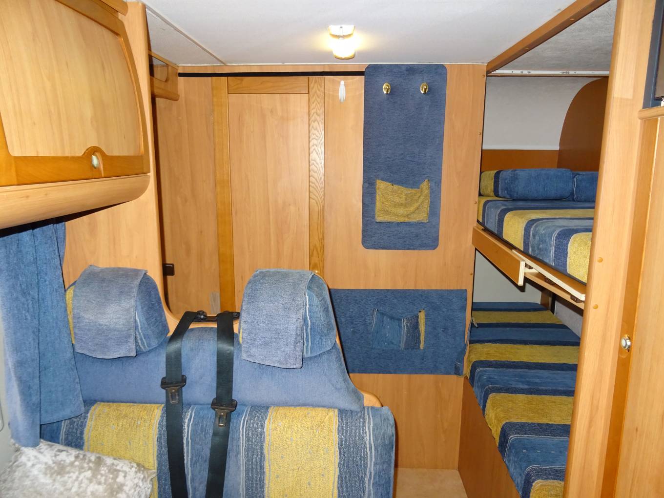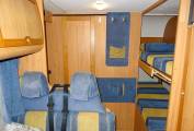 Sleeping arrangements you have a spacious double over cab bed, the dinette area converts in to a double bed and to the rear you have single bunk beds. This being said if you didn't require the bunk beds you have the option to collapse these down to allow a much larger garage area, giving you enough garage space to carry bicycles, camping furniture etc.