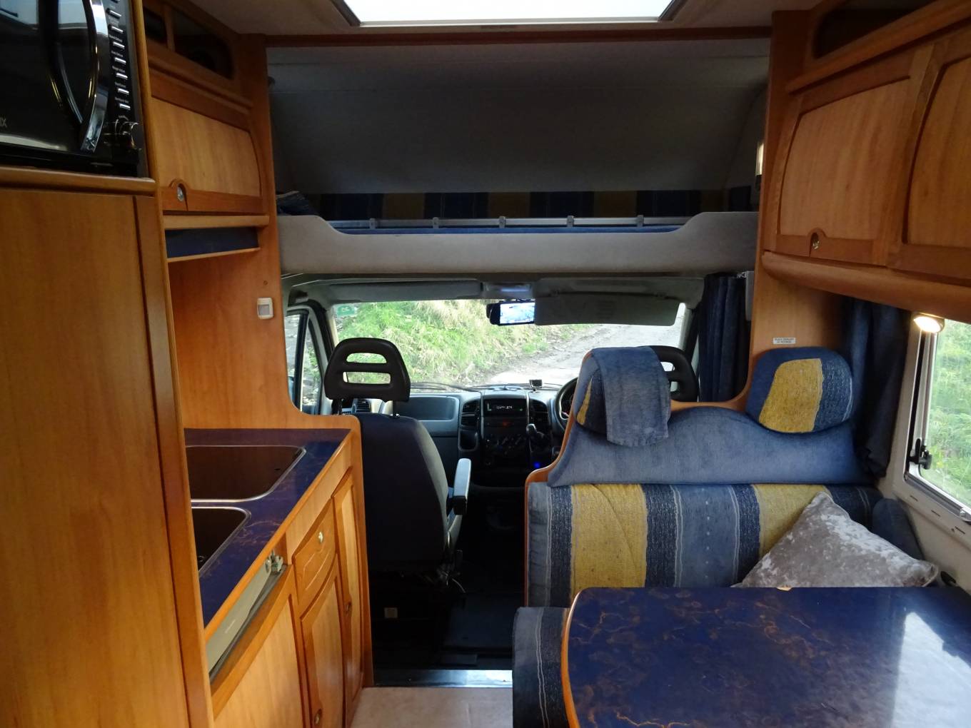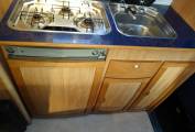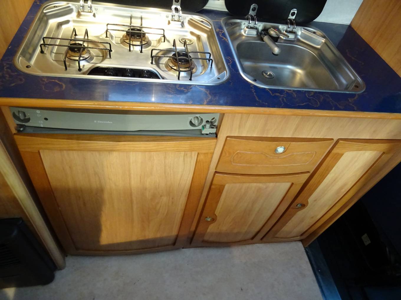 Upon entering the habitation area you will find a centre kitchen/Dinette. The kitchen comes equipped with a 3 way fridge with small freezer compartment, 3 gas ring hob, sink and microwave, accompanied by a spacious dinette area.