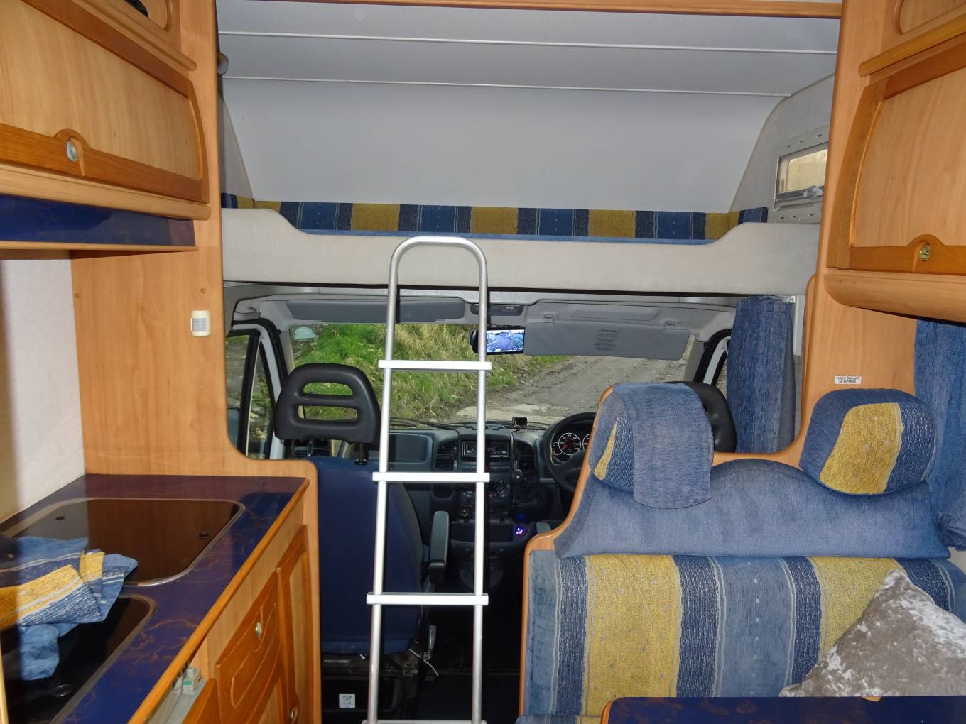 Now on to the exterior the vehicle is fitted with reverse cameras and sensors, an alarm, TV Aerial, Tow Bar, roof rails, ladder and bike rack. Along with garage space which you do have the option to make larger if bunk beds are not in use.