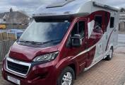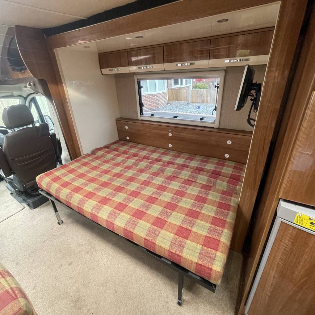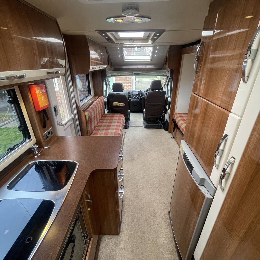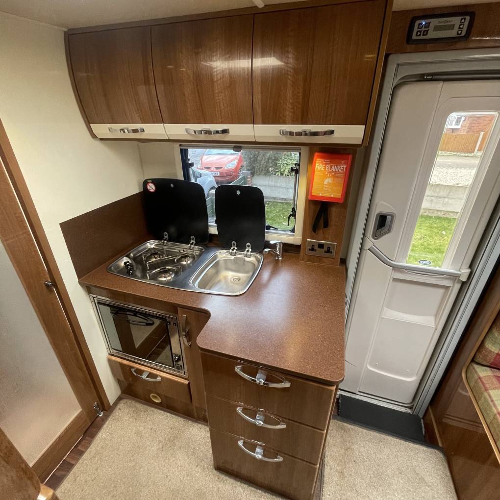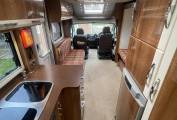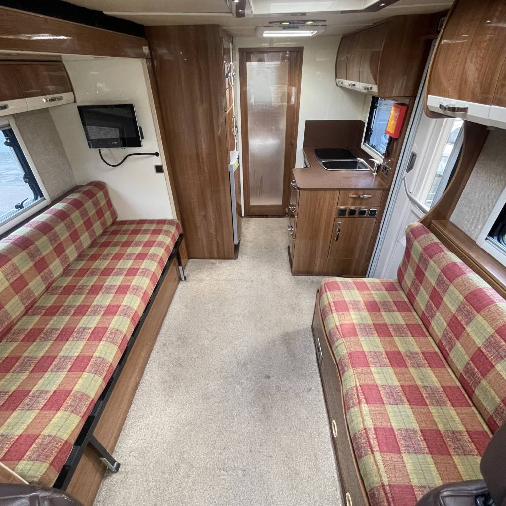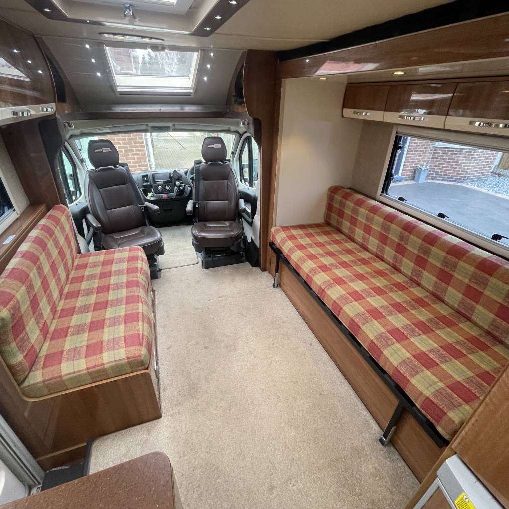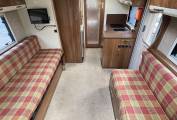 The main attraction is the slide-out side which provides a huge lounge or dining area with 2 captains seats to allow for more people to be seated. The large offside settee converts to a double bed and the bench seat to the nearside can be used as a single bed for children.