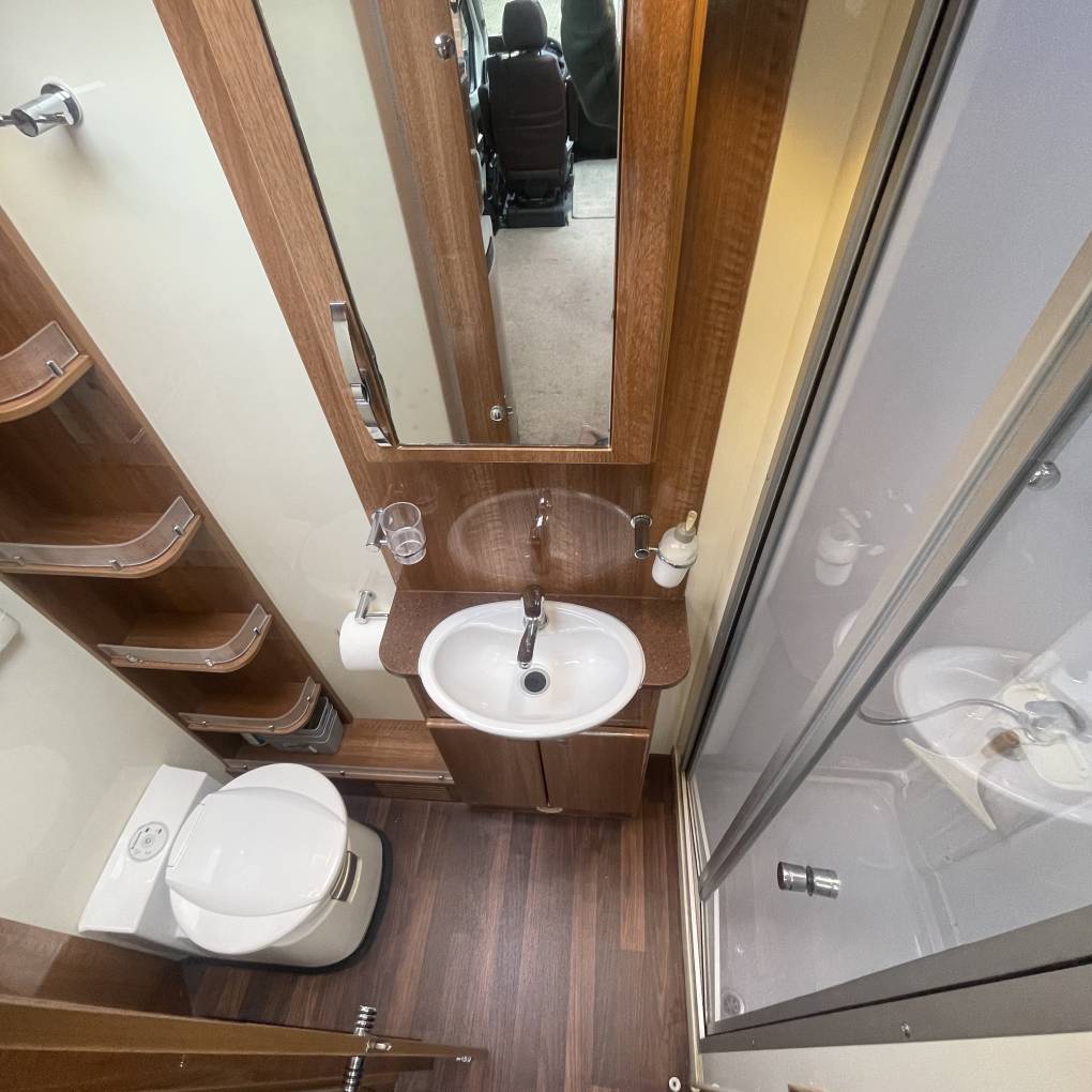 The well-appointed kitchen comes compete with sink, hob, oven, fridge and lots of great storage space such as a spacious wardrobe. At the rear is a luxury, spacious bathroom with separate shower cubicle and yet more great storage space. For more information, the additional photo file or to reserve this motorhome please call or email.