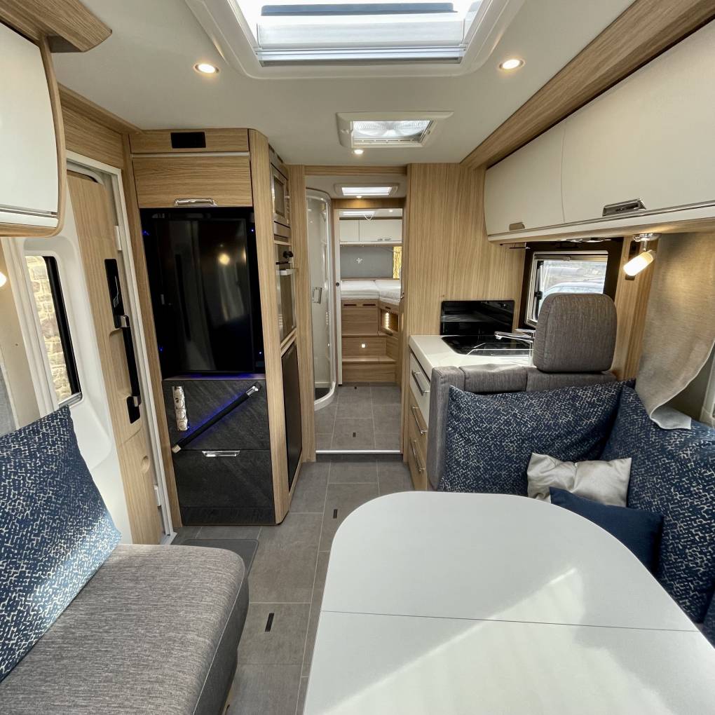 This high class motorhome comes with the Miami Blue finish externally and Modern Line Verade Oak internally with grey and Grand Cru No. 16 upholstery.