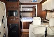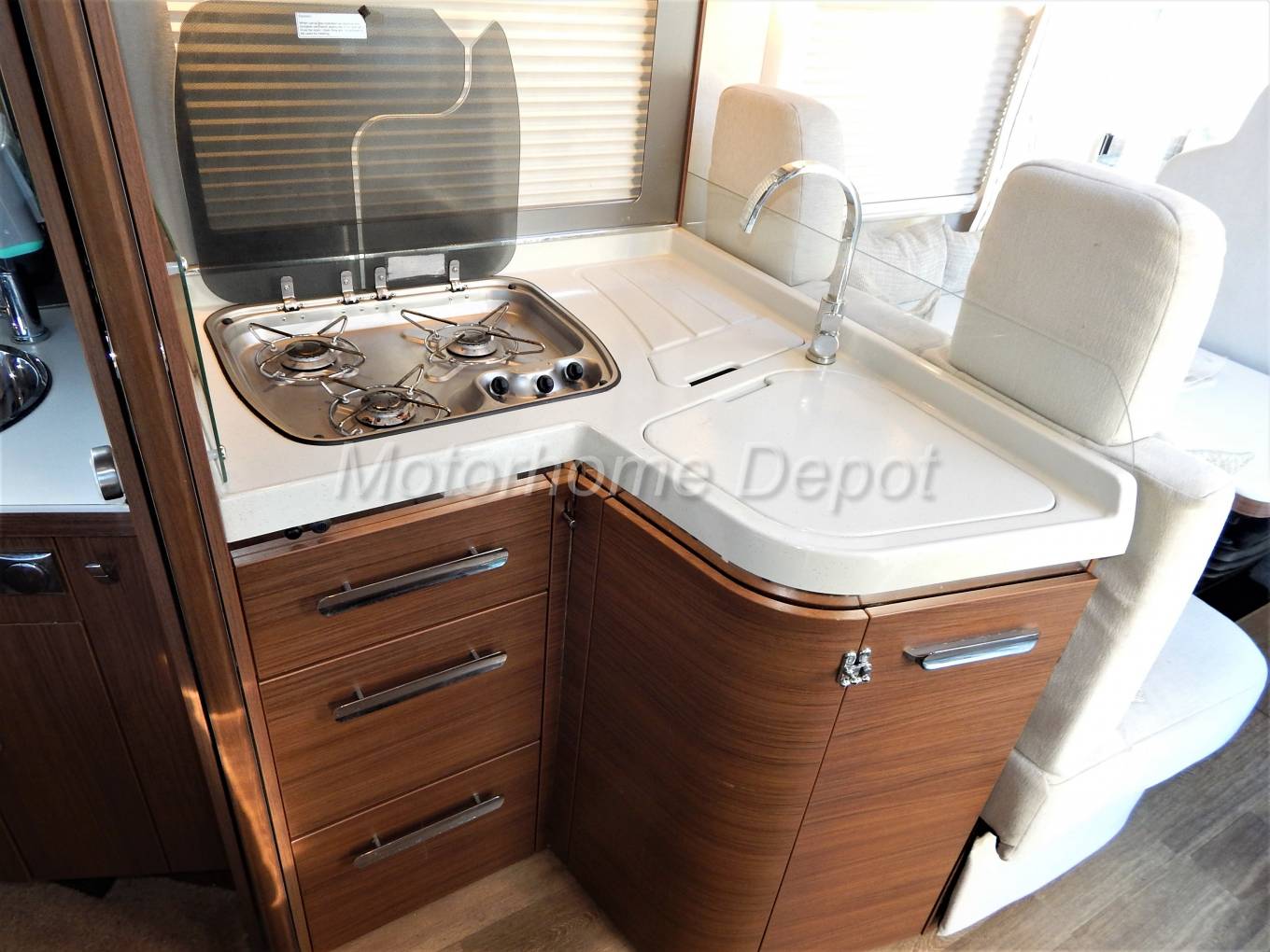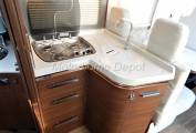 Moving rear is the L shaped kitchen with mineral work surface incorporating integral sink with chrome mixer tap and drainer. There is 3 burner gas hob. Under the counter is plenty of cupboard and drawer space for all your holiday provisions which can be centrally locked. Opposite is the Microwave; Oven & Grill; Dometic Absorber fridge with separate removable freezer box this can be run automatically on: 240v 12v or gas depending whether you are plugged in on site or wild camping.