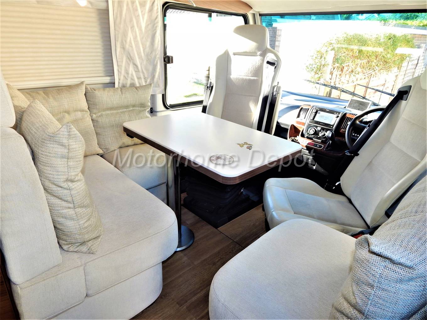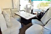 We enter the motorhome on the drivers side immediately to the right of the habitation door is a single side seat & opposite the dinette with L shaped sofa with two travelling seats. The front seats rotate to join this area so you could seat 5 around the table if entertaining on site. The table can easily be positioned in the middle or pushed to one side.
