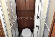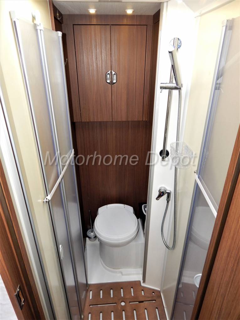 Moving rear is the large rear bedroom with French bed offset to the drivers side there is a TV Point with Flatscreen Avtex TV at the foot of the bed. This area can be sectioned off from the front using solid sliding doors from either side. There is a separate dressing area with sink & vanity unit. The bathroom is on the passenger side next to the bed which has the shower at the front which can be sectioned off from the toilet using Perspex doors front and rear to keep the area dry. The toilet is a Thetford cassette style fresh water flush with a swivel head.