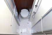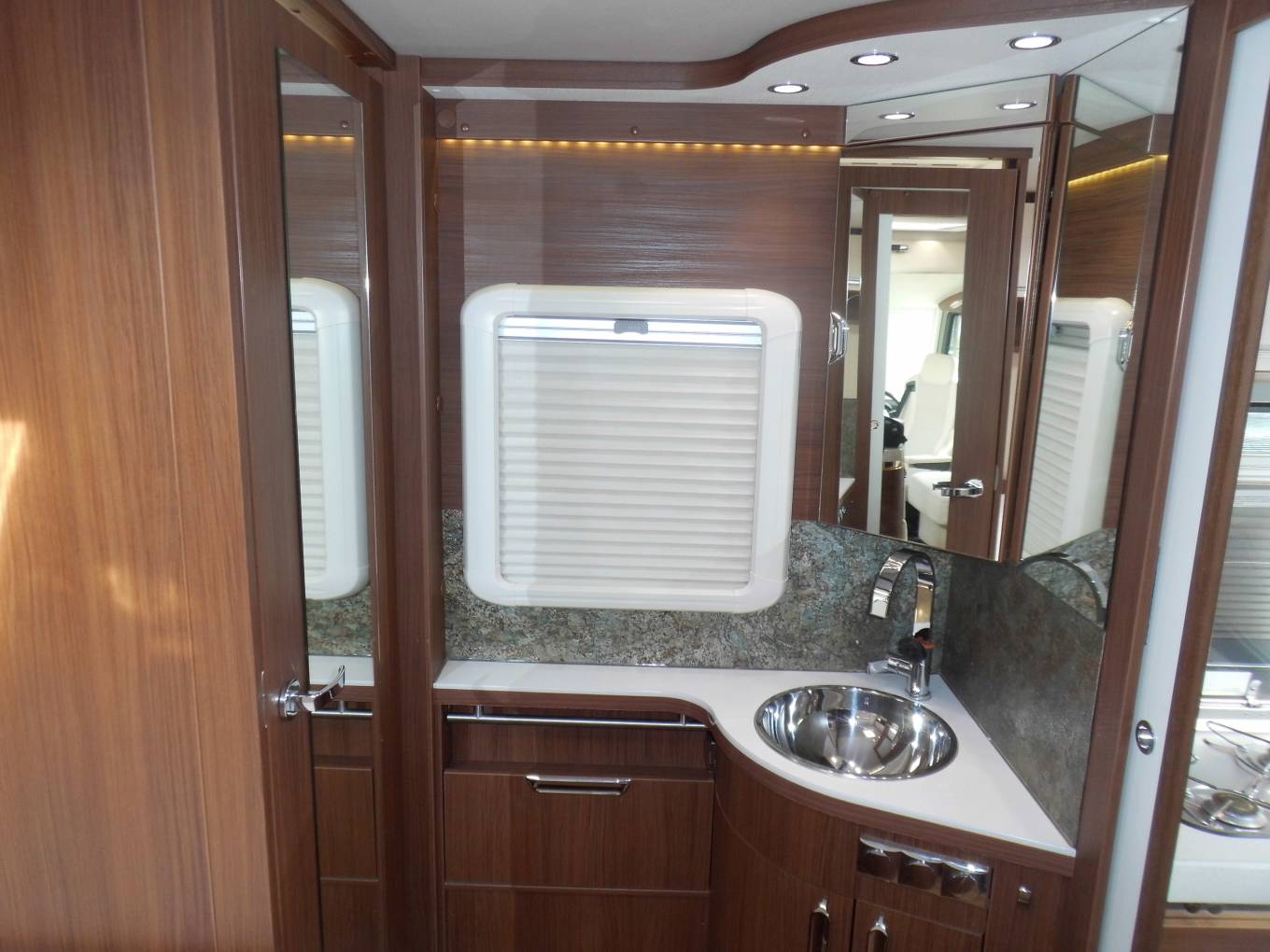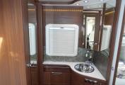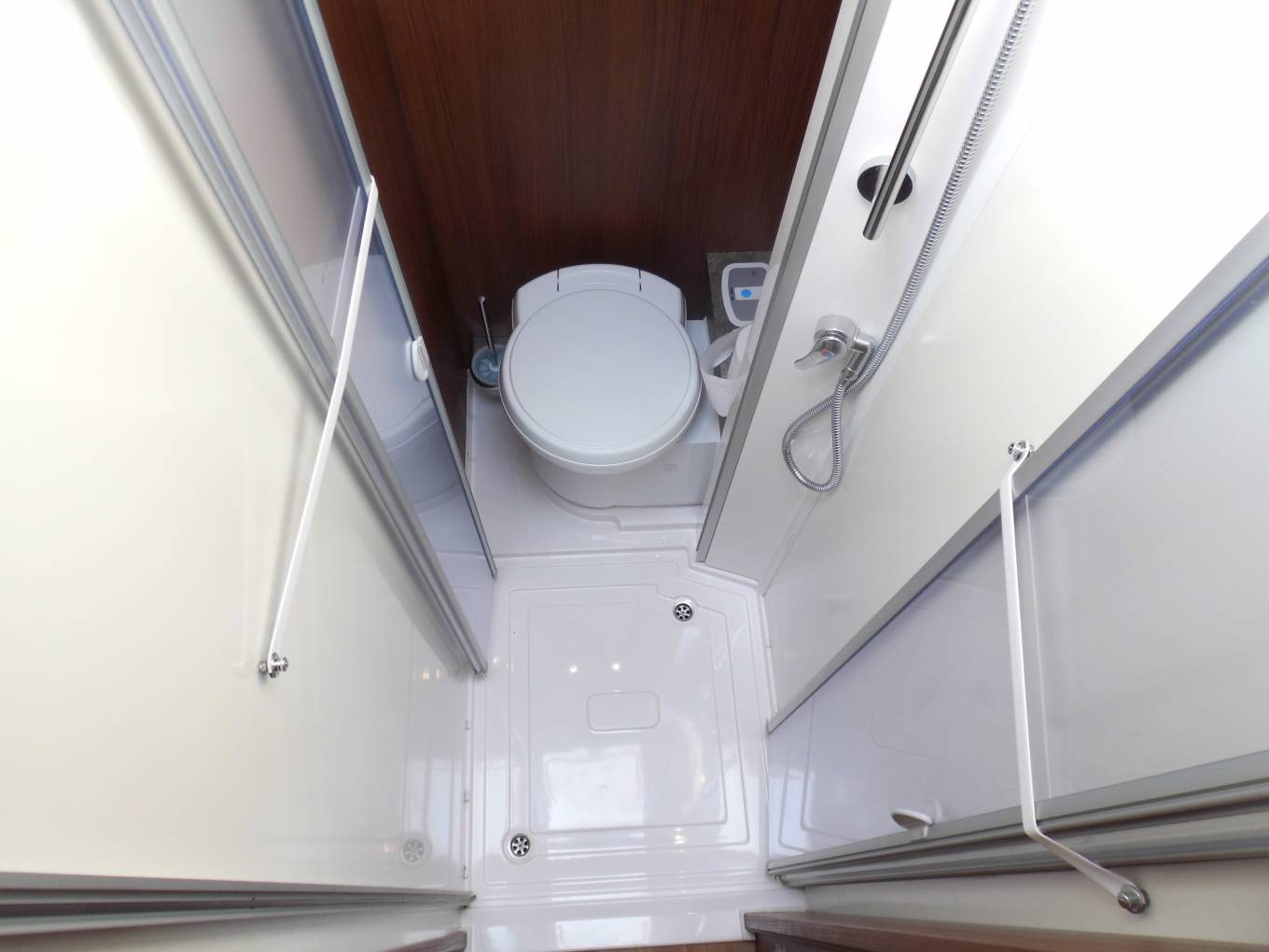 The washroom area is split into two areas, with a toilet and shower wet room in the nearside rear corner and a separate vanity area with a round stainless sink and mixer tap underneath a mirrored cabinet. In the shower and Thetford swivelling cassette toilet compartment the shower tray occupies the foreground and has a pair of bi-fold doors.