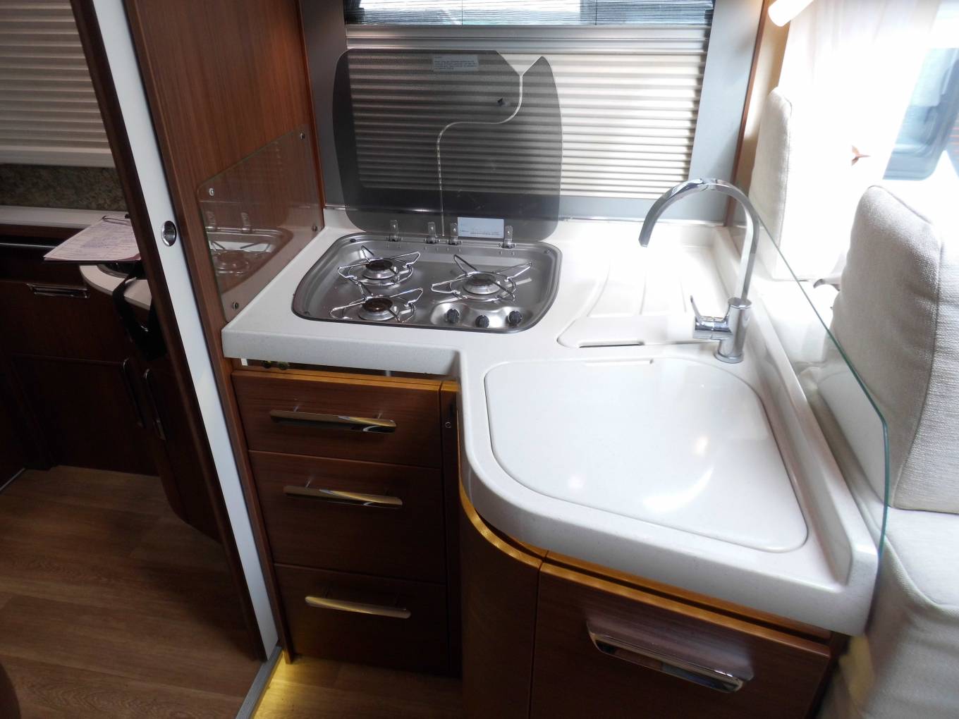 burners. Opposite is a grill above the Dometic fridge with freezer compartment. Above this a microwave. There