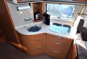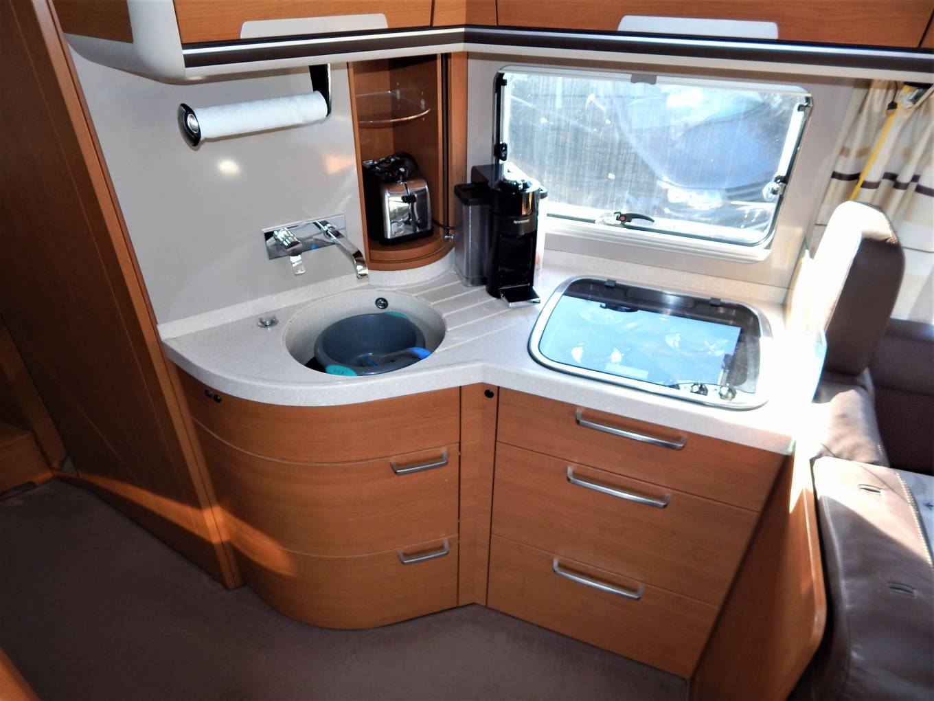 The kitchen directly behind the dinette comprises of a 3 gas burner Thetford hob and single sink drainer with chrome mixer tap. Underneath the counter is plenty of large drawer space for all your kitchen utensils which can be centrally locked from the front or rear while travelling. The Fridge Freezer to the left of the habitation door is a Thetford Tec Tower, Oven & Grill at the top and an absorber unit underneath which is fully automatic to run on, 240v, 12v or gas depending on whether you are wild camping or plugged in on site.