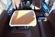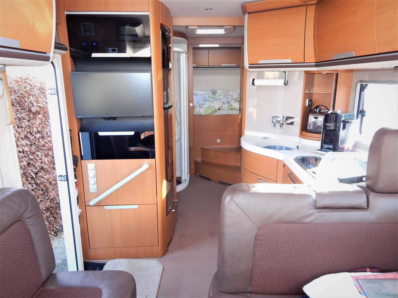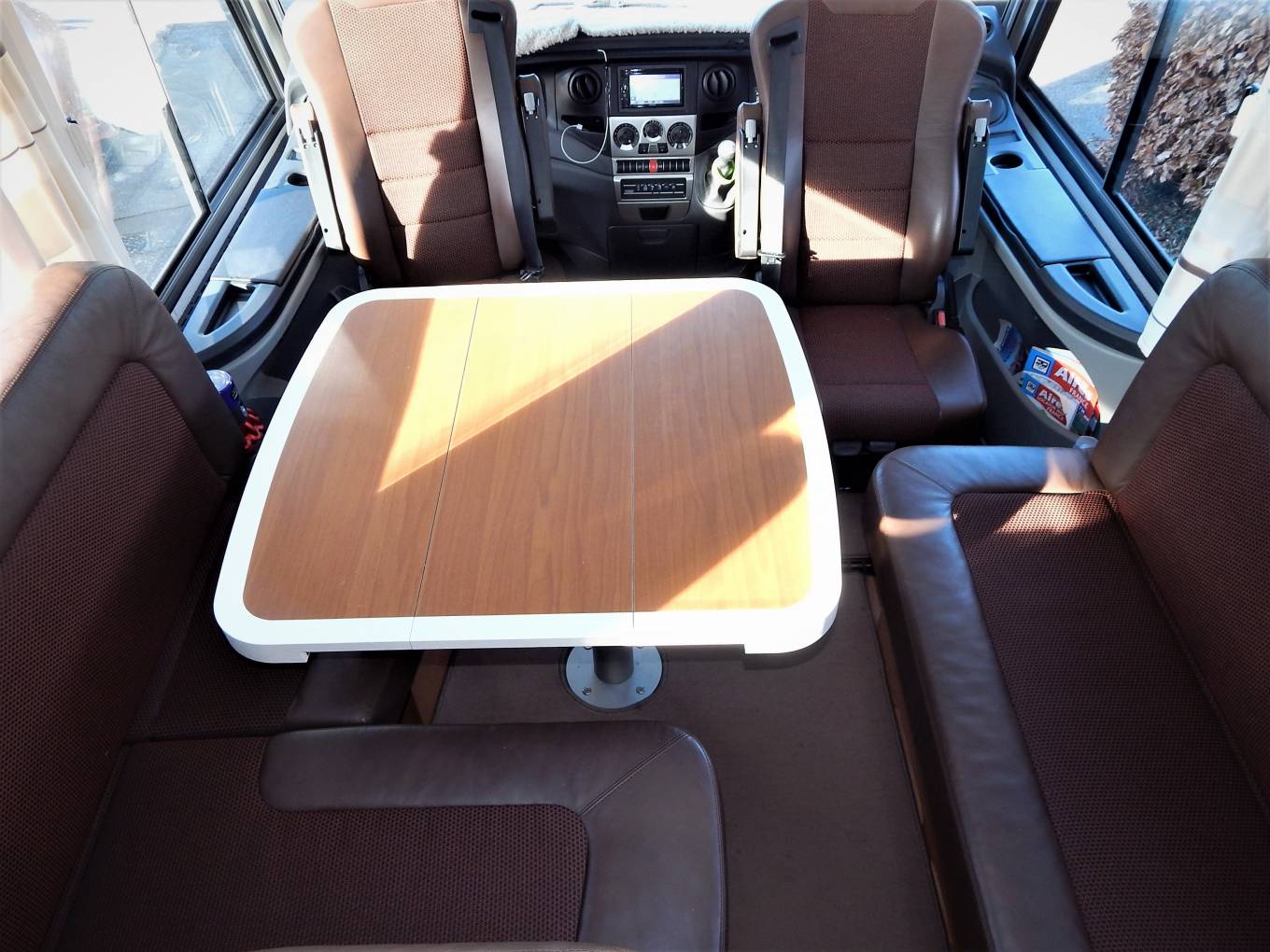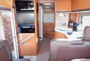 We enter the motorhome on the drivers side via an electric step immediately to the right is the Dinette which consists of an L Shaped Sofa on the near side and a double sofa of the drivers side, the table opens up to expand and both the front seats rotate to join the area. You could happily seat 7/8 people if entertaining on site. Two forward facing 3 point seat belts for travelling passengers. The TV Point is to the left of the Habitation door and comprises of an Avtex TV with DVD player, also being is served by and 85CM Oyster Satellite Dish.