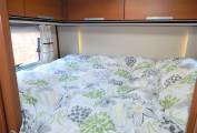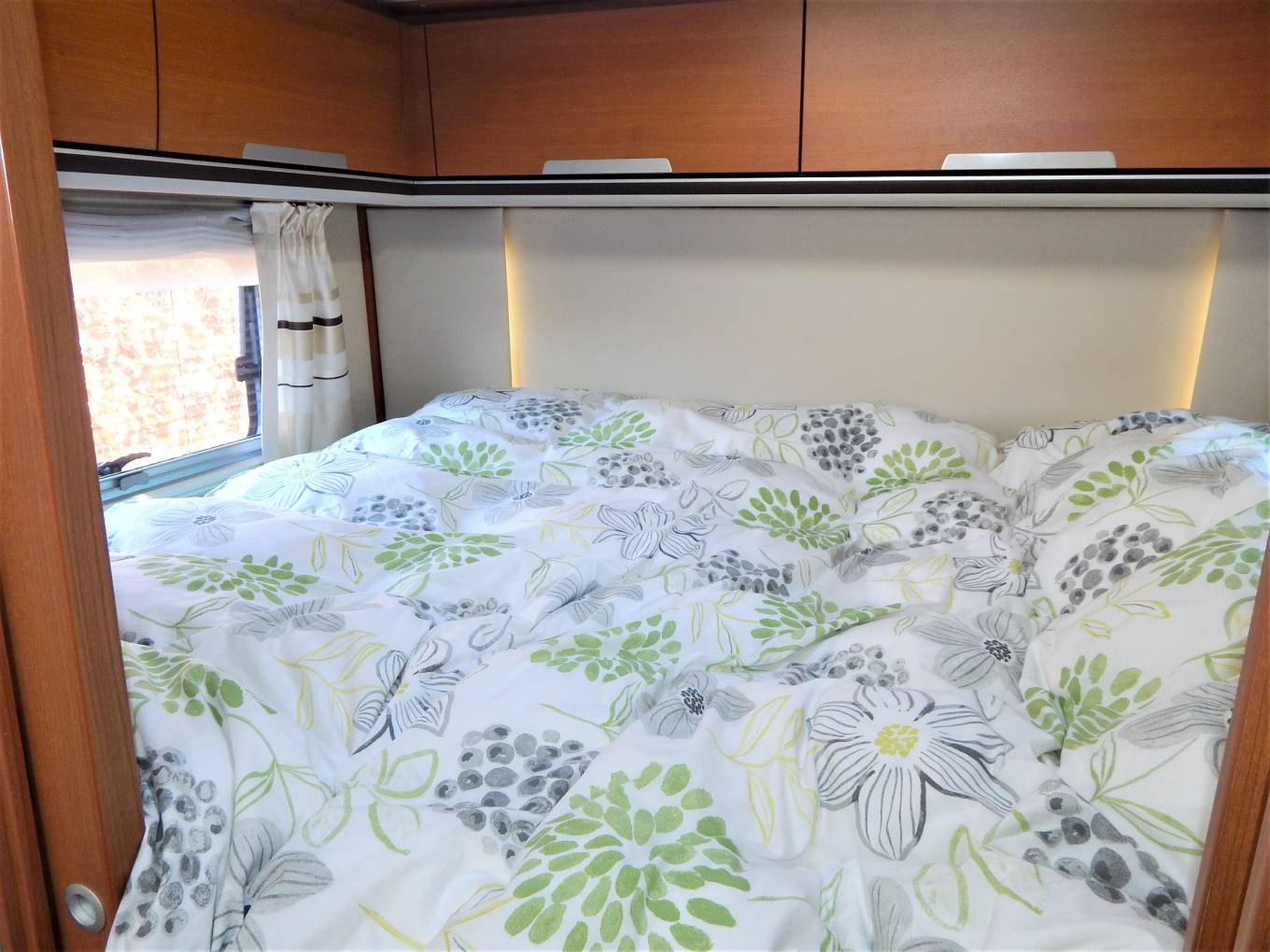 The rear double bedroom is a transverse bed over the garage and is accessed by built in steps and has its own TV point and plenty of overhead storage. The front double bed is a manual drop down over the cab.