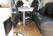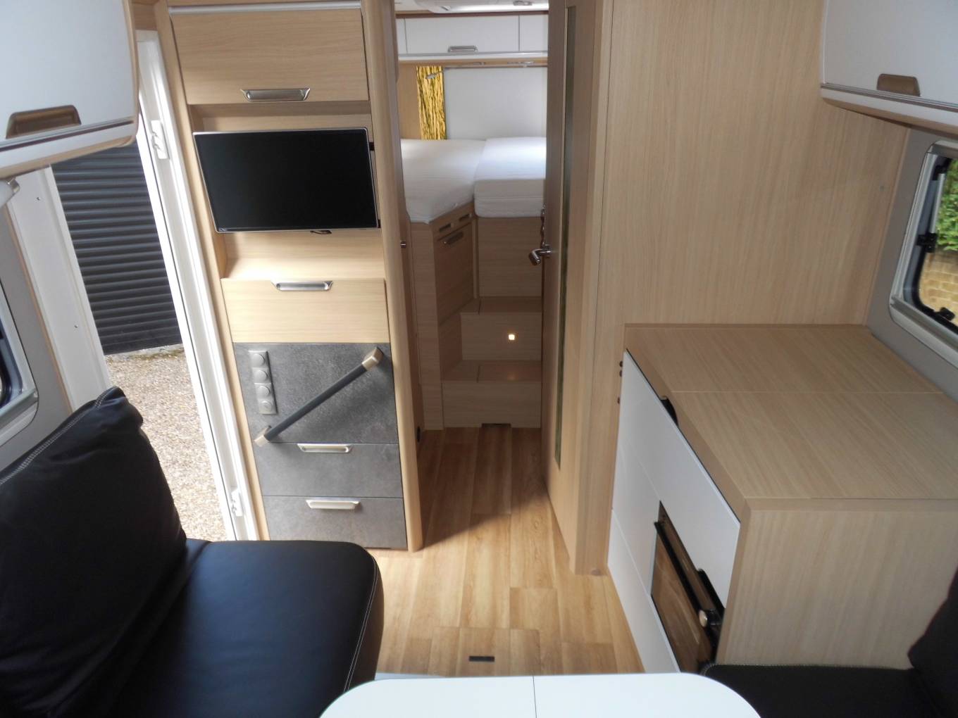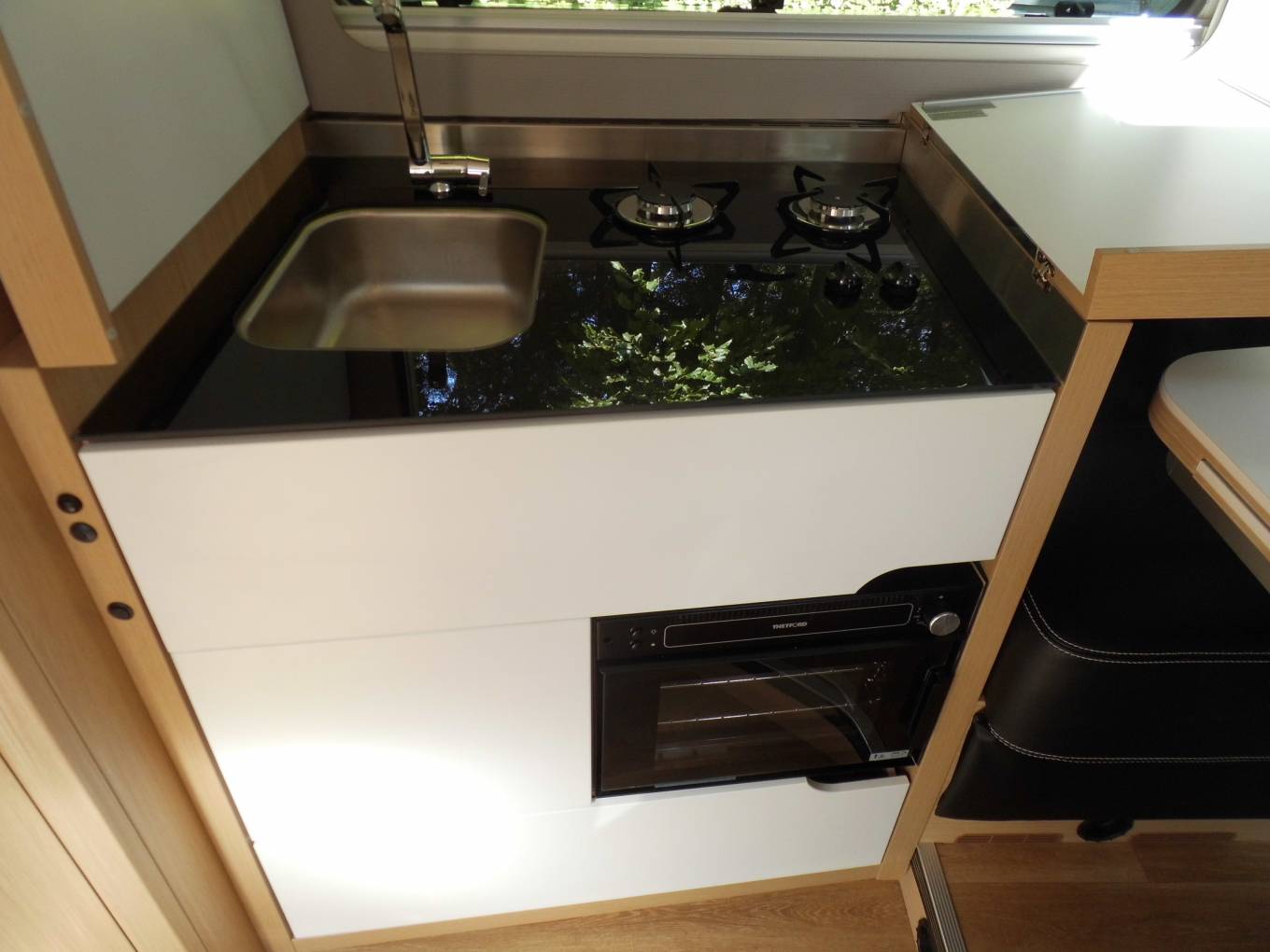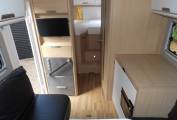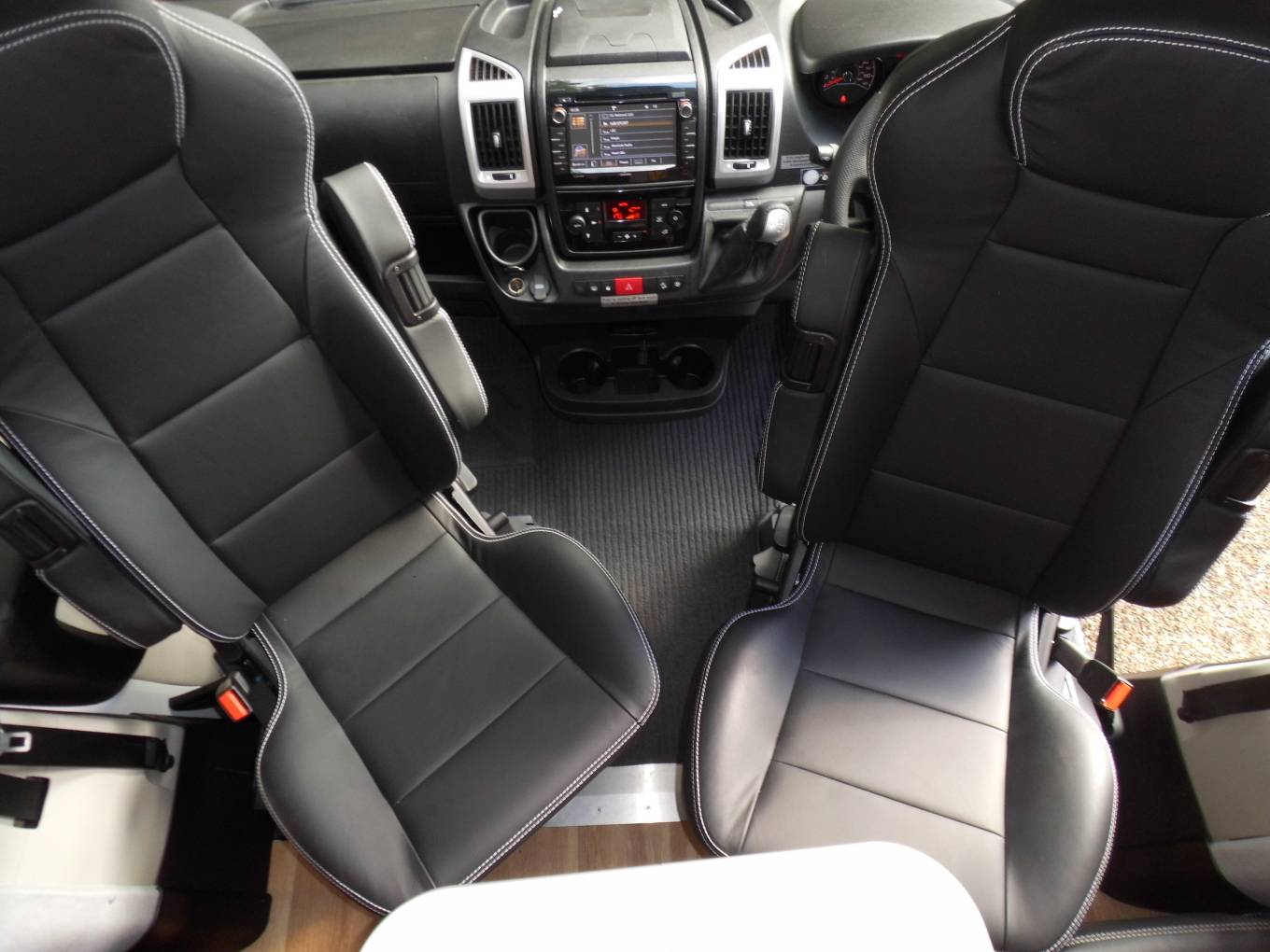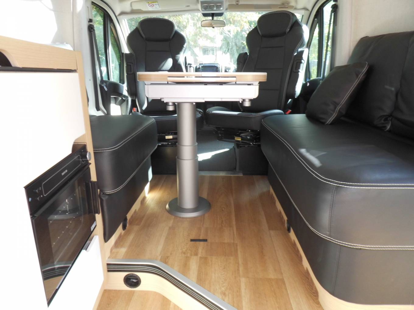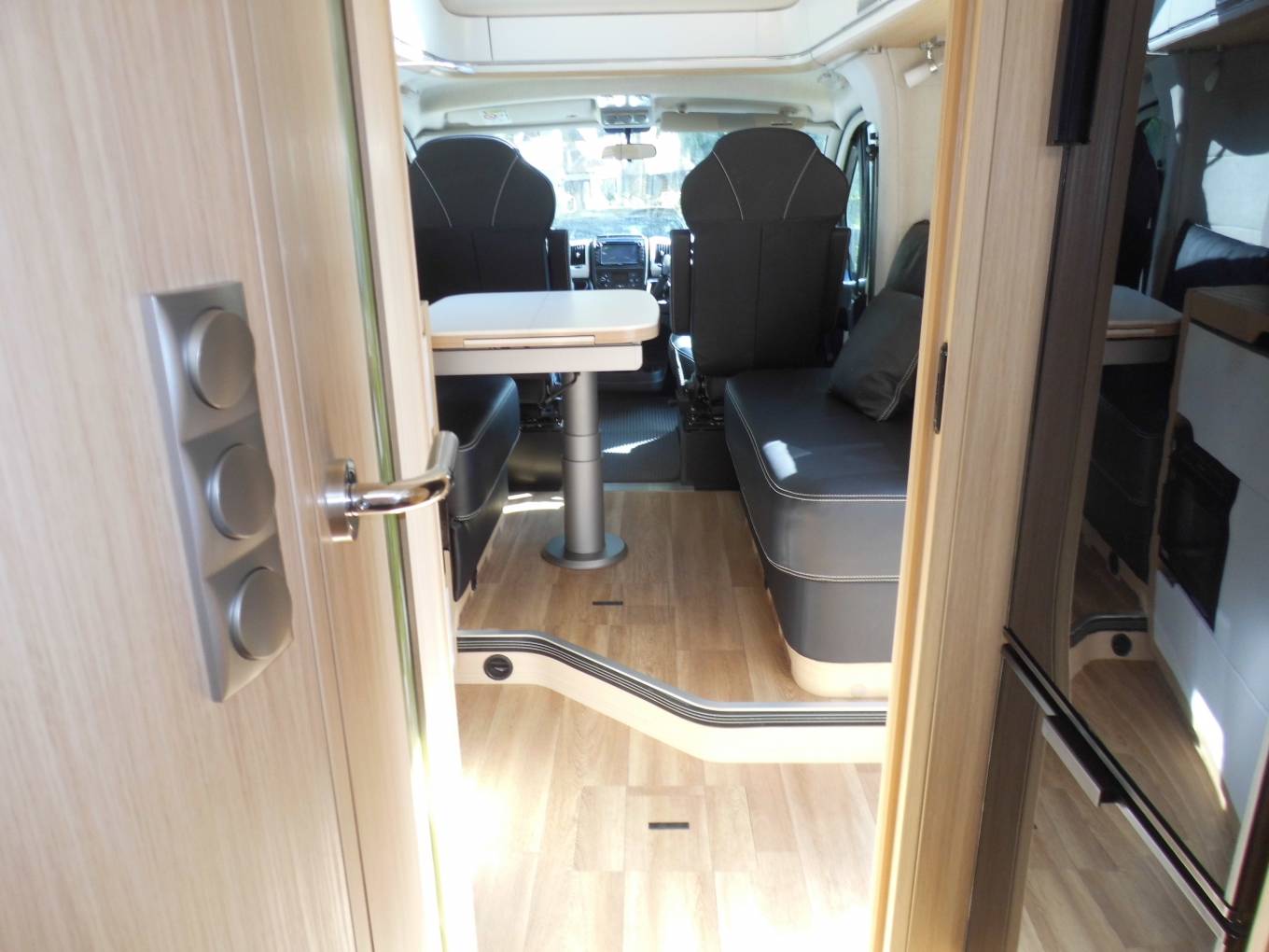 The habitation area is beautifully finished in a lovely grey anthracite leather and the seat cushions provide superb comfort thanks to a 3 layer foam concept. The continuous overhead cupboards feature an easy to use push-to-open gas powered system. Meal times are a real pleasure thanks to the generous lounge table which is fitted with a multi-directional displacement mechanism enabling you to lower it in to your ideal dining position. In the evening, switch on the ambiance lighting with LED technology and your motorhome becomes an oasis of calm and tranquility.