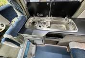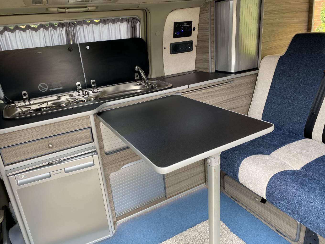 The kitchen consists of a two gas burner hob, a 12 volt fridge, a sink with cold water tap and plenty of storage space.