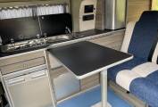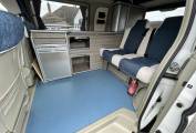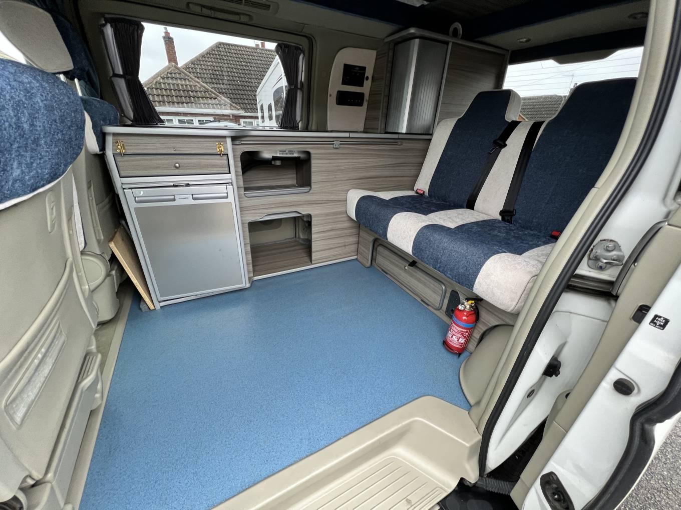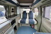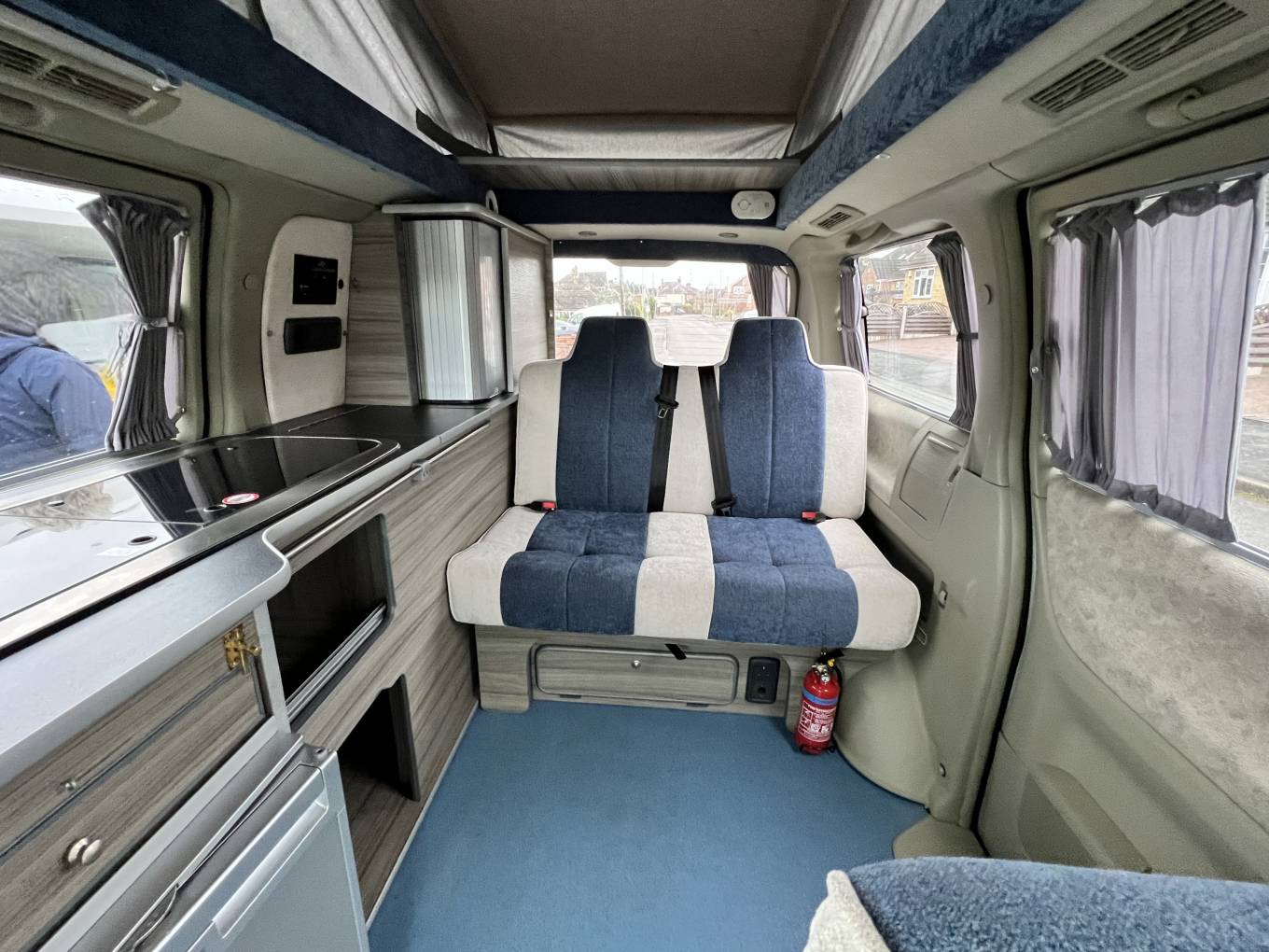 On entering via the sliding door, to your left, the front passenger swivels round. in front of you on the drivers side is the kitchen and to the right the twin belted rear bench seat.