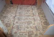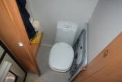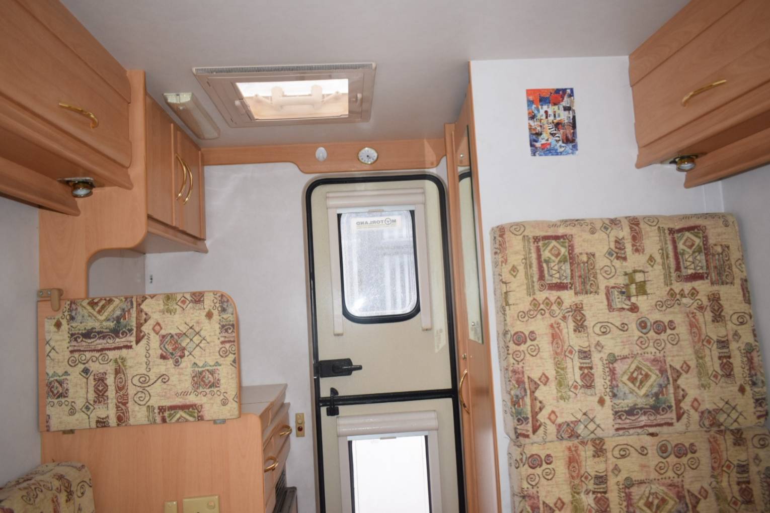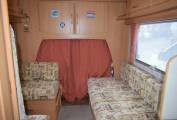 Across centre of the motorhome are on one side is an inward facing settee and on the other a two person dinette which together form a double bed at night time.