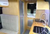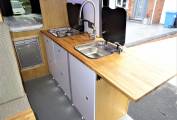 Starting at the rear of the camper, there is the elevated large fixed double bed with multiple lights and a roof skylight with blinds. Beneath the bed is the large garage which has bags of storage space. In this area is also the inverter along with electrical equipment. The engine is also linked via a split charge so you dont have to worry about getting a flat battery. The Inverter also enables you to be able to run 240v off grid without any mains hook up.
