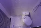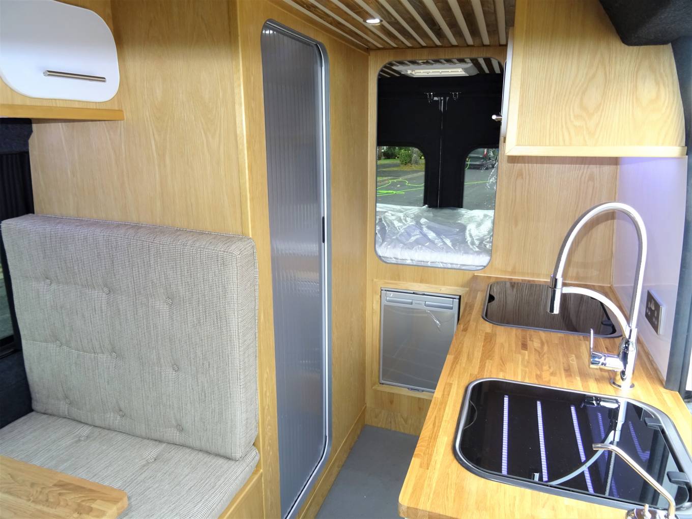 Moving through the motorhome we have a full length separate shower with instant hot water supplied from the truma heating interface and built in water tanks and a Thetford toilet with the cassette located in the exterior unit. Opposite this area we have the kitchen unit which includes a wash basin with mixer tap, 3 ring gas hob, a microwave and a Dometic fridge with freezer compartment. There is also a separate 10L drinking water tank and a separate tap on the right hand side.
