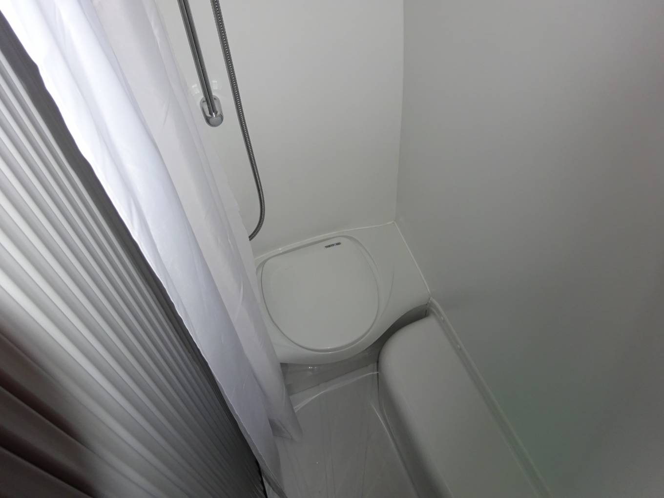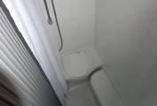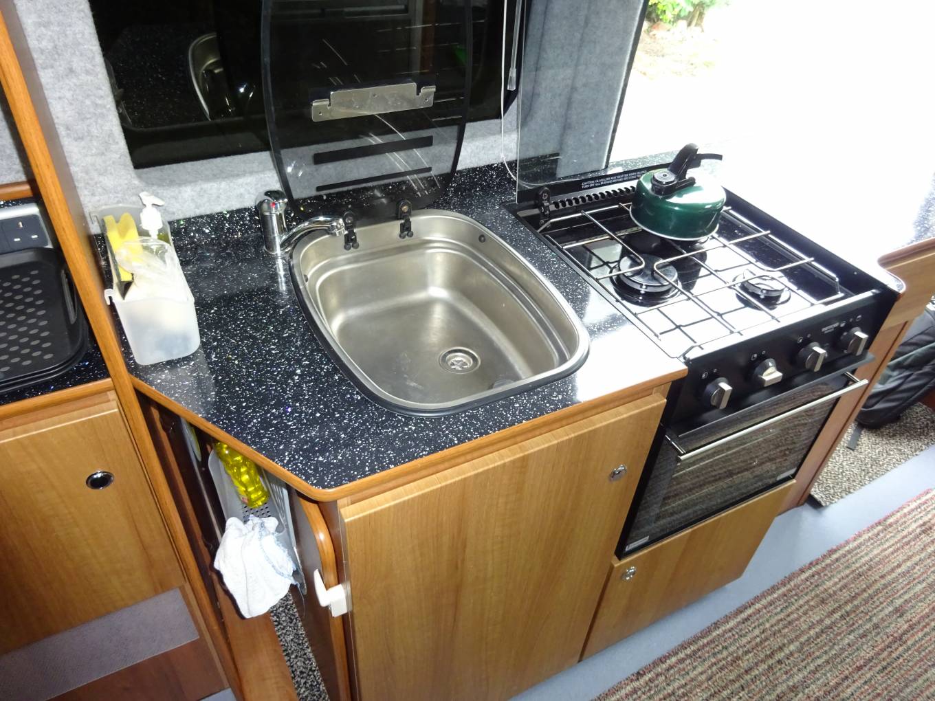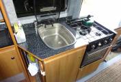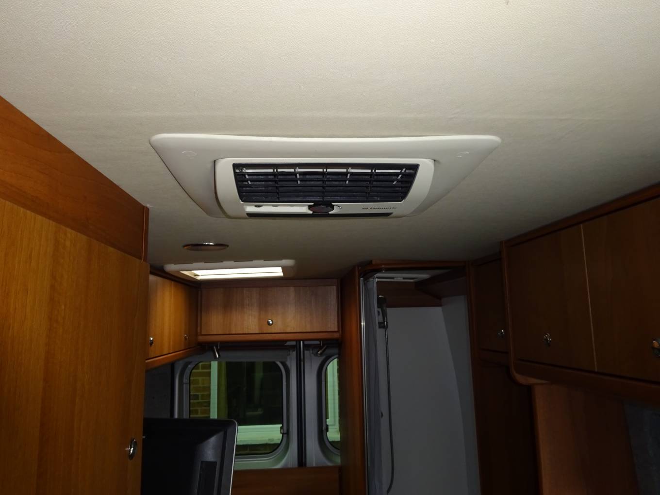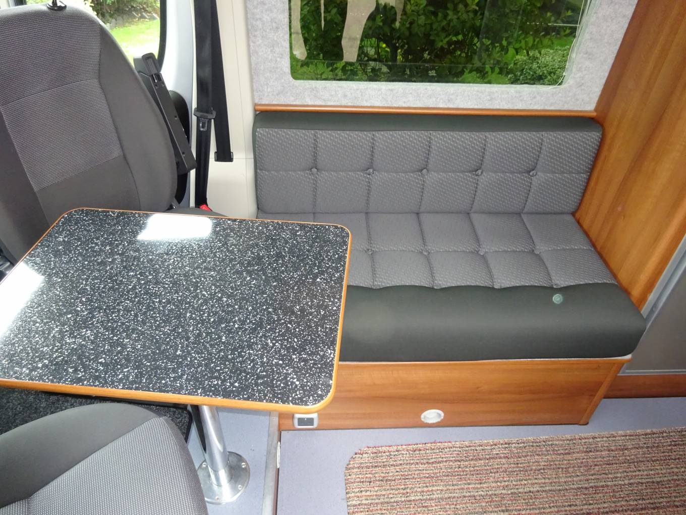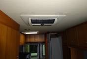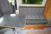 In the living dining area a comfortable small sofa faces the side opening door and both front seats swivel to face the table which is tube mounted between them when required. This conversion has the luxury of a roof mounted Dometic Habitation Air Conditioning system. The hot water and heating is provided by a Truma Combi 4 boiler, this is under the sofa. Also under the sofa is the Sargent EC155 Power Supply Unit with fuse box etc. Still under the sofa are the two leisure batteries and a fire extinguisher. The Truma Boiler and Sargent controls are mounted at eye level next to the sofa. A Thule electric step is fitted to give easy access through the side door and there is a Fiamma F65S Canopy for shade.