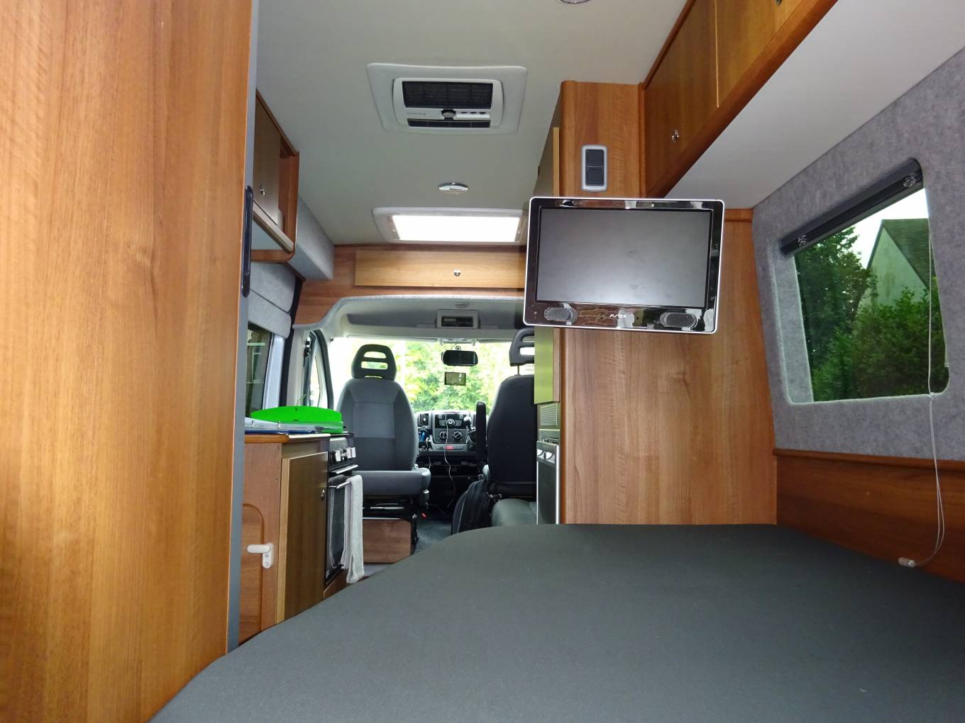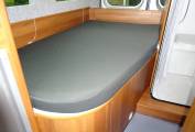 So what we have is a two berth camper van with an excellent range of facilities ready for wild camping or motorway cruising. At the back is a fixed rear bed measuring approx 78 by 44 inches, in the sleeping area there are four windows, each with a blind, four upper cupboards and a roof light. Under the bed is a generous storage area best accessed through the rear doors. The washroom has a tambour style door then shower with shower curtain and Thetford toilet in a wet room style. The central kitchen has fridge with freezer compartment on one side then sink with mixer tap and glass cover and Thetford 3 ring hob with glass cover and oven on the other side. There is good worktop space to the right of the hob with a further fold out worktop. The wardrobe has plenty of hanging space and houses the aerial box.