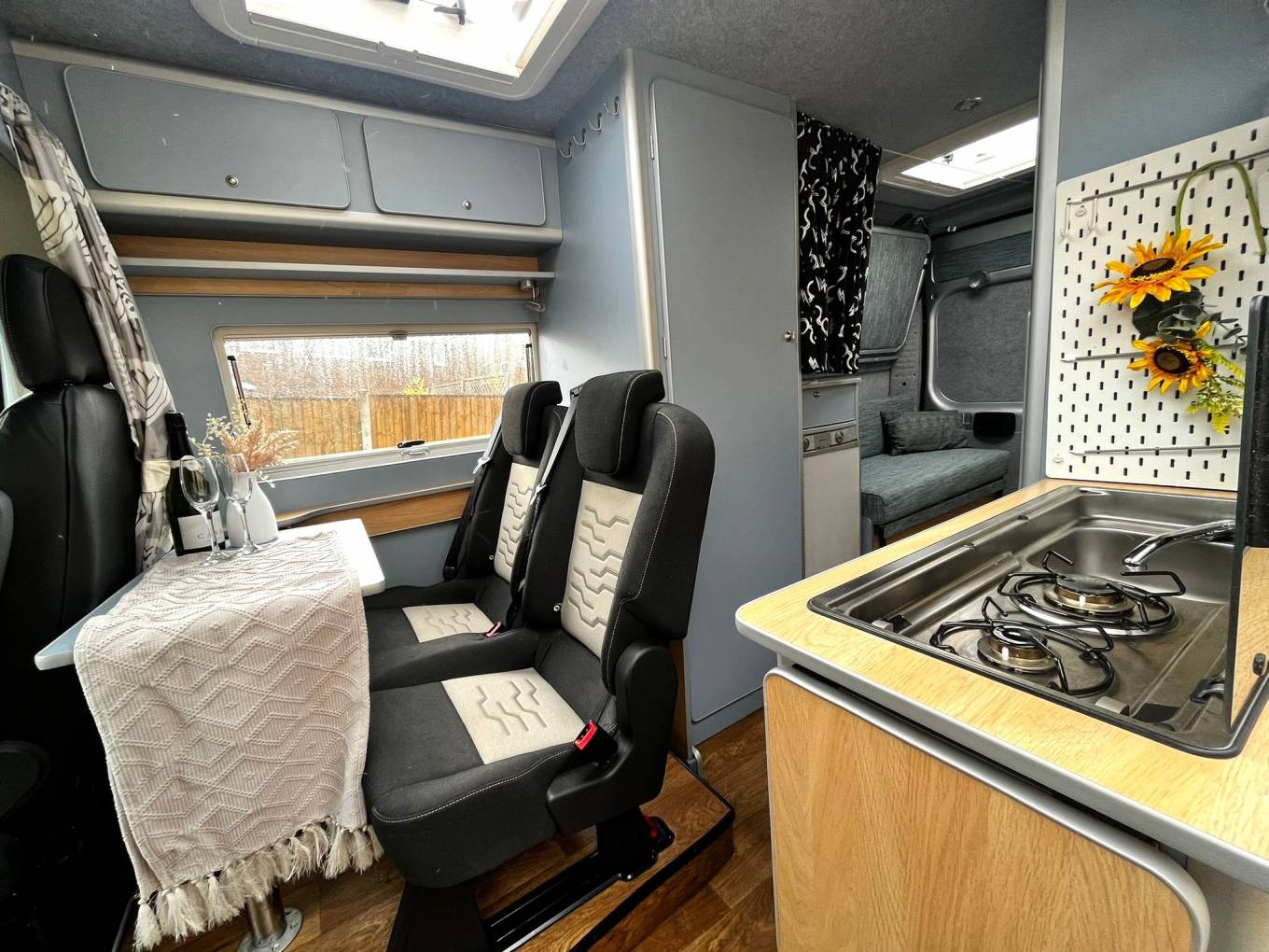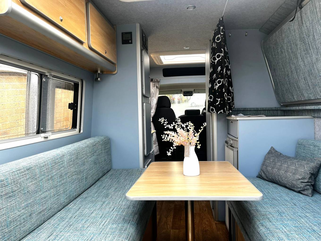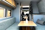 Stepping inside the Camper, you enter at the dining area, the dining area offers room for 4 to sit comfortably with the use of the drivers and passenger seats on swivel bases.