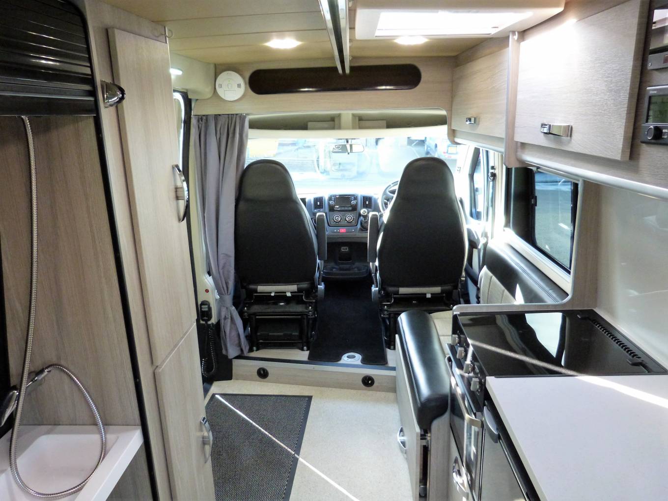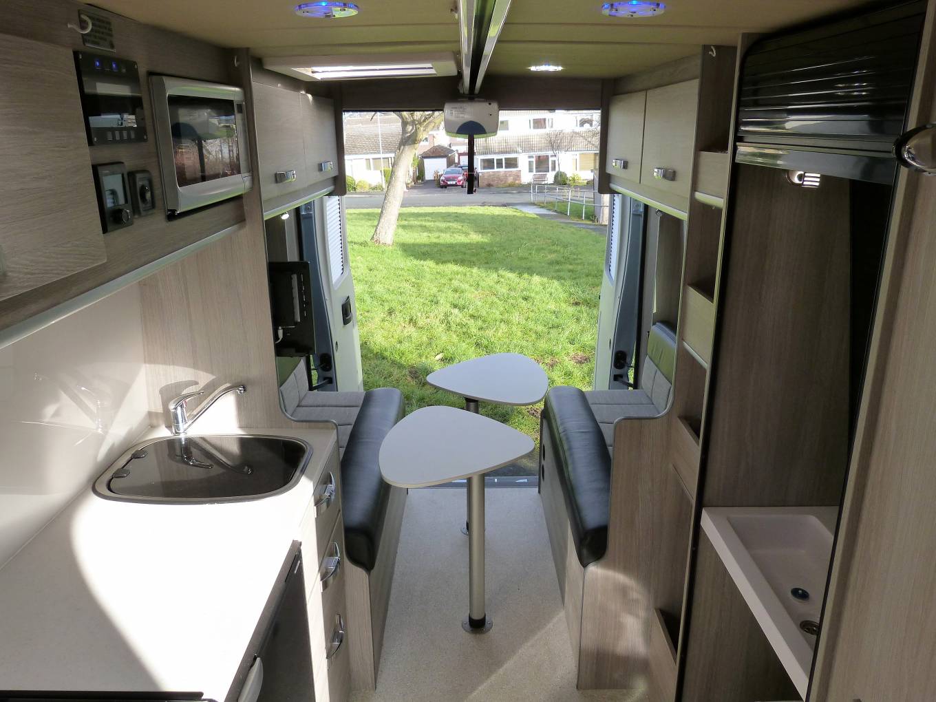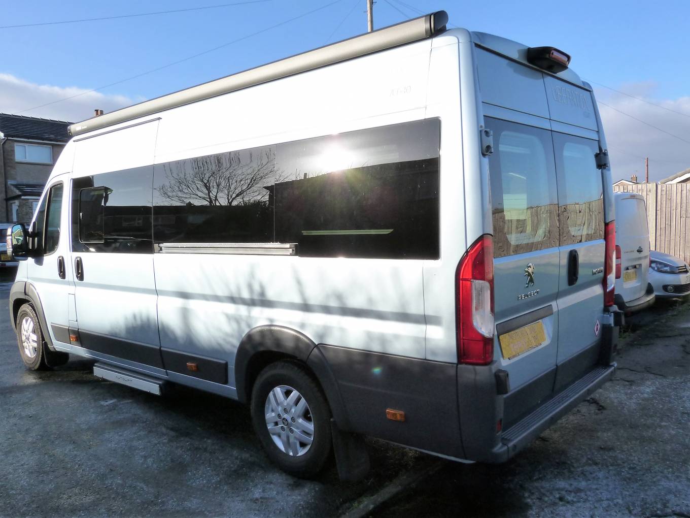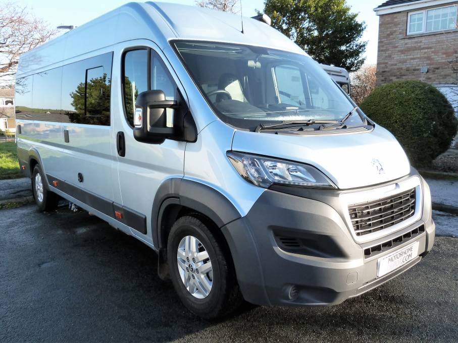 Please call with any questions on 01423 609985. This is a superb example of a recently converted, ex demonstration campervan conversion that can be used as a traditional campervan, or with additional lifts and hoist is a Wheelchair Accessible Vehicle, WAV. The conversion was commissioned by Brook Miller, a specialist mobility equipment supplier, based in Elland, West Yorkshire and then converted by RP Motorhomes of Darley, near Harrogate. It is finished to the highest standard possible, has a new vehicle smell and the only travelled 2134 miles. It is more a 3 bed conversion than a 4, with This Peugeot Boxer Liberation VC640 has a 1997cc engine with 6 speed manual gearbox for class leading efficiency and long distance fuel economy. The standout features of include the fantastic rear lounge, with part leather upholstery, the level of workmanship, including smooth lines and returns throughout and the feeling of space. There are several areas where a wheelchair could be positioned, there are no securing points at the moment, so the new owner has the freedom to choose. At the rear, the 2 sofas are easily converted to a generous double across the full width and combined with the rear doors opening, give a fantastic view out of the rear doors. There is a hoist above with payload of 130kg; the rail that runs the length of the motorhome. There is a washroom area, with a portapotty, sink and shower attachment and drain in the floor above which a wheelchair can be situated, the wrapround shower curtain prevents water ingress into the other parts of the van. The galley kitchen has a cooker, with 3-burner gas hob, oven, grill, sink, fridge, plus a microwave; all complimented by good sized worktop and plenty of storage. There is a lift for access in and out of the motorhome on the near side and this has a payload of 300kg, it is a fully automatic operation. Behind the drivers seat is a smaller sofa which converts into a single bed. Upfront, this exceptional campervan benefits from 2 swivel seats; full Bluetooth capability including a rear-view camera, phone, sat nav and audio; cruise control and leather seats. Additional features include: Truma heating system, TV with aerial, solar panel, 2 tone touch sensitive LED lighting in the ceiling, parking sensors, plus an underslung LPG tank to save weight, space and money vs gas bottles. It is immaculate inside and out, with full length awning and plenty of headroom inside. It works as a WAV or a more traditional campervan and should be viewed at the earliest opportunity in Brighouse, West Yorkshire. Part exchanges are welcomed on this vehicle, for further information please call us on 01423 609985 quoting reference number 142157