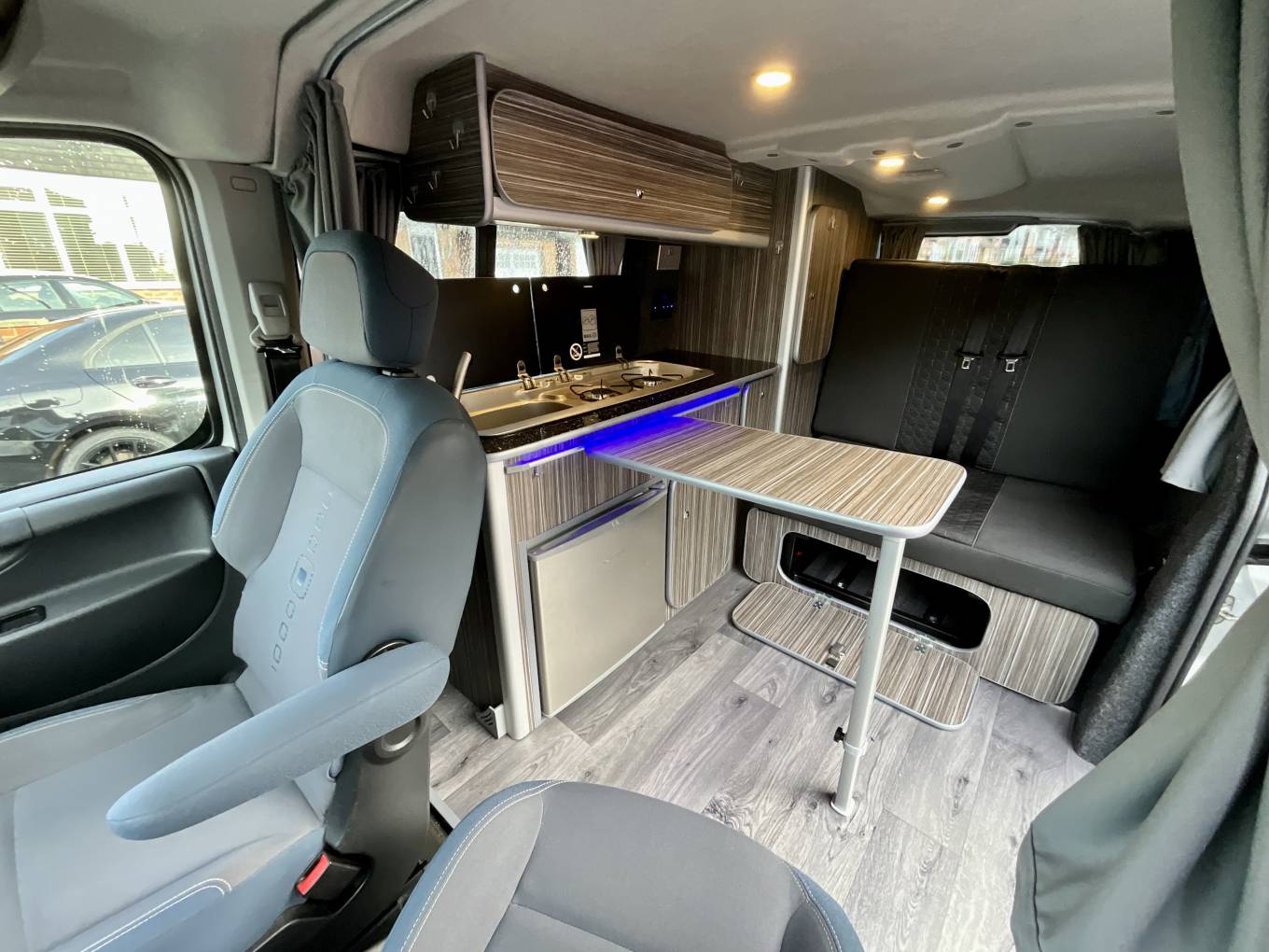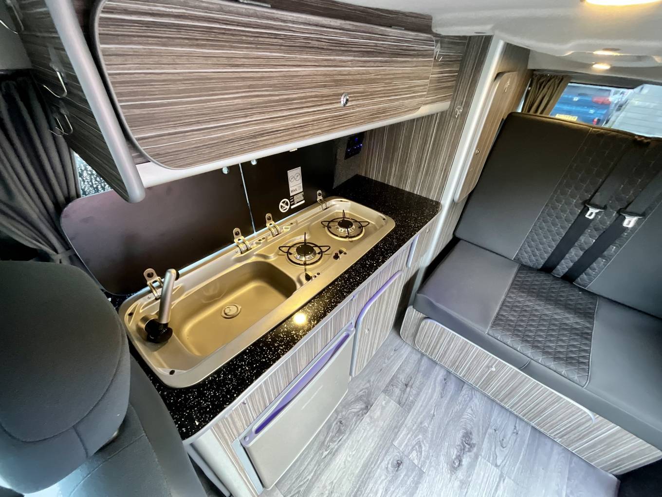Fully equipped with a kitchenette with Russell Hobbs fridge with freezer compartment, two gas hobs, sink, LED lights, fold out table, this campervan has everything you need to take it straight onto the site.