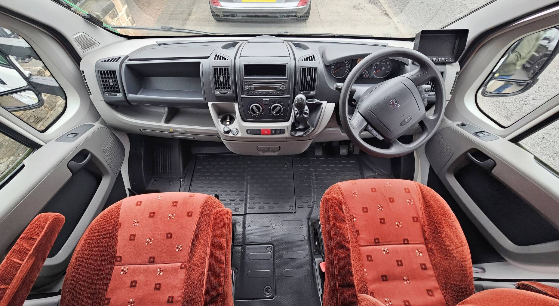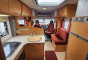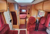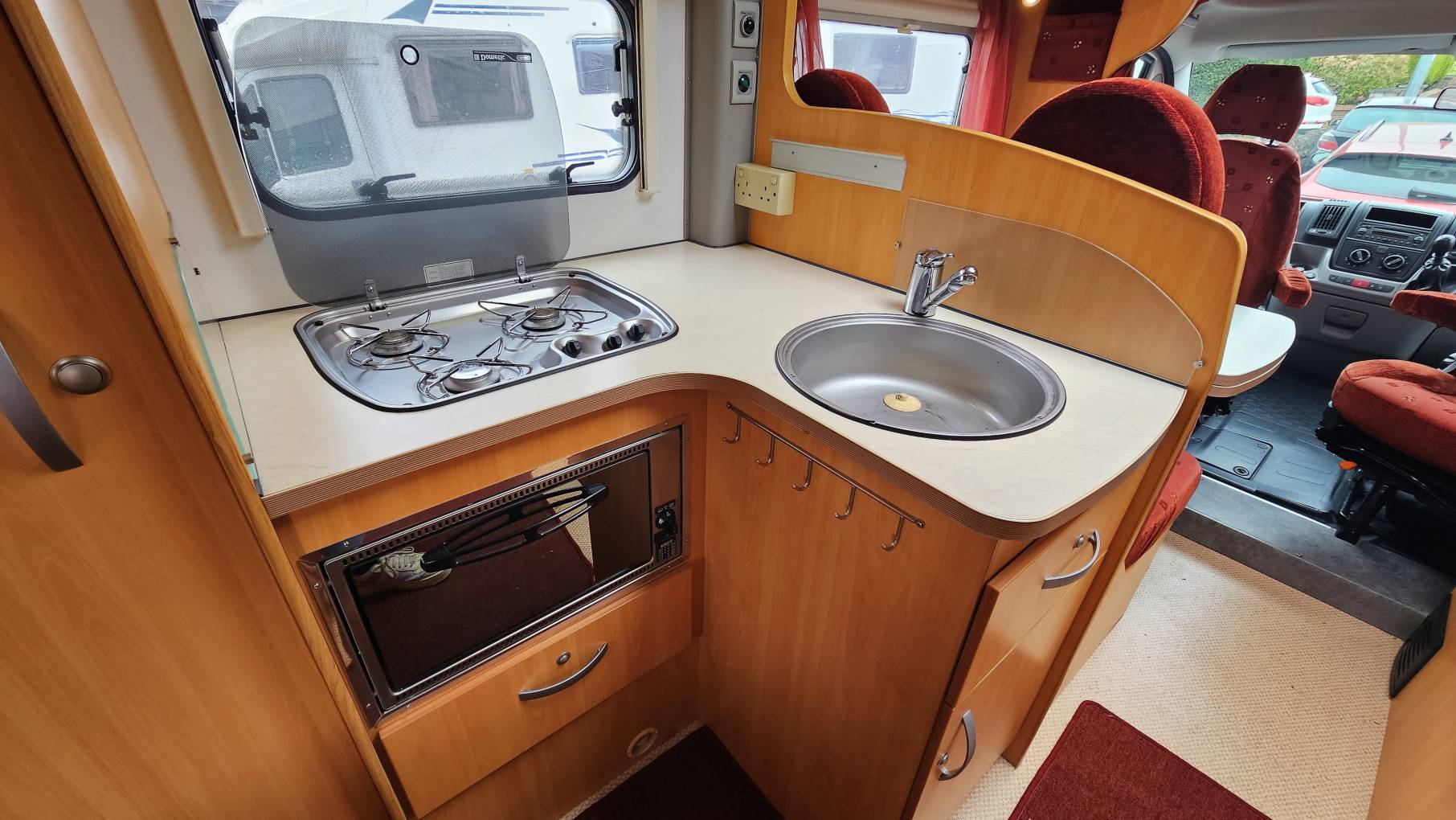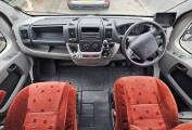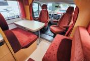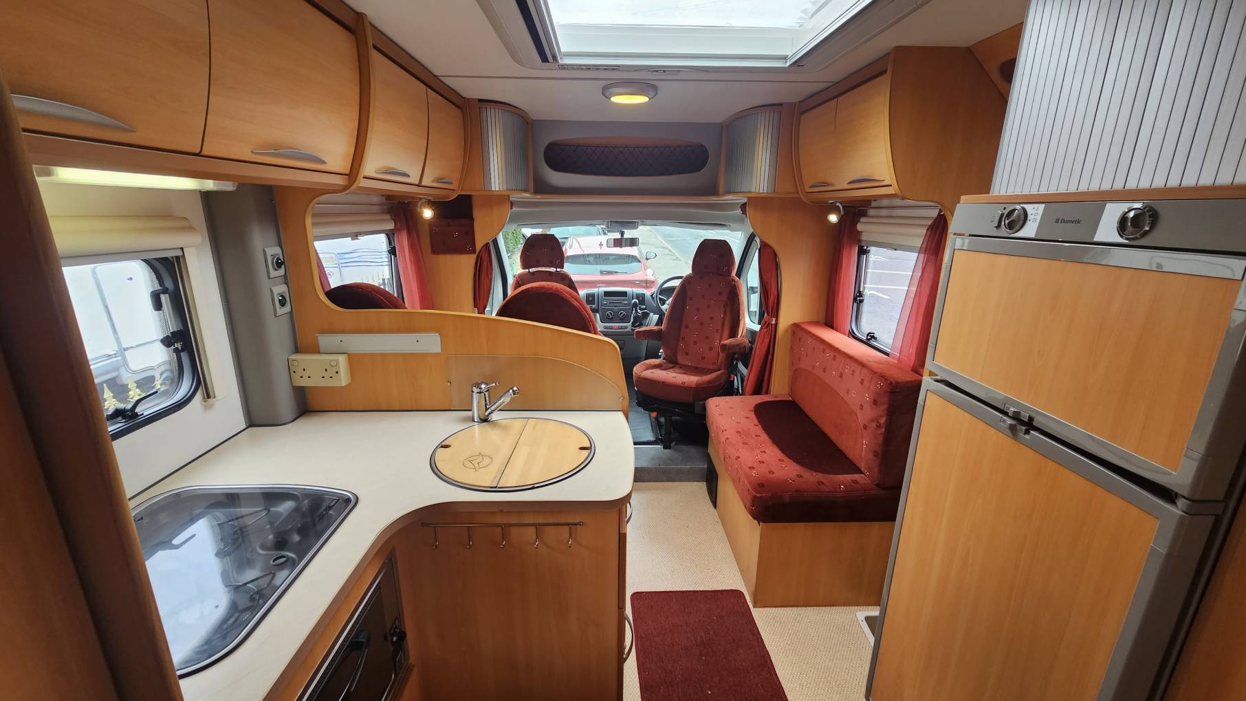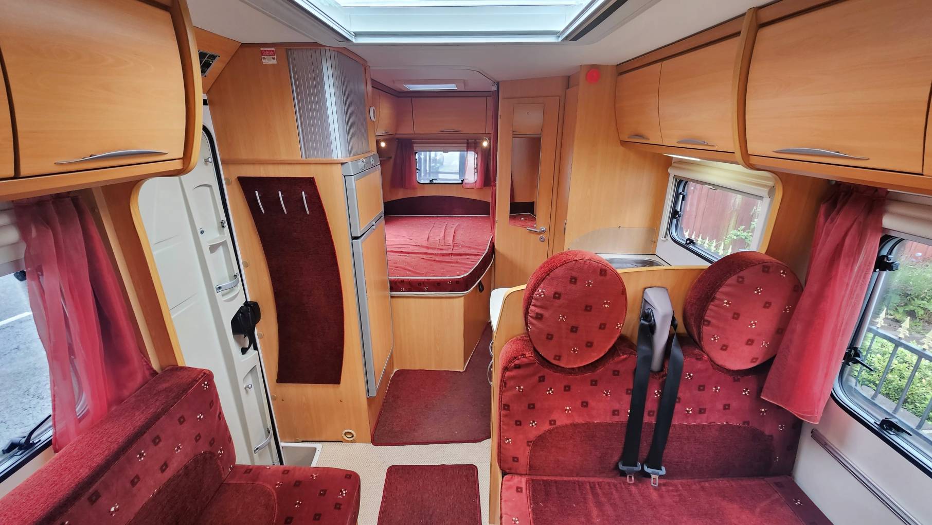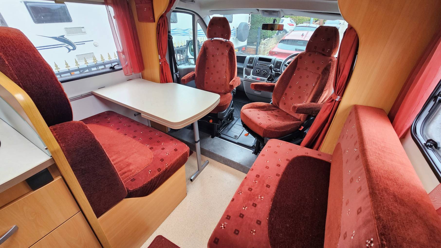 The chassis has a low step to enter but there is an additional manual step if required. The dinette is situated just to the right of the habitation door it has a fixed table with extending leaf to join a side seat. The front drivers and passengers seats also swivel round to join this area which will then comfortably seat 5. The forward facing passenger seats also have 2 x 3 point seat belts for travelling passengers.