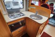 The Kitchen area is just behind and consists of an L shaped worktop incorporating a round brushed metal finished sink with chrome mixer tap. The Hob has 3 X Gas Burners with a separate oven & grill below, there is also ample cupboard & drawer space. Opposite there is Dometic 3-Way Fridge Freezer, above this there is a cupboard with TV Point with included TV Bracket.